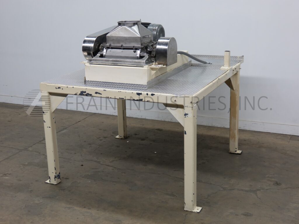 Quadro, Model 197, 304 stainless steel particle size reduction Comil. Rated up to 800 lbs of product per hour – depending on materials and application. Equipped with 10" diameter x 6" deep stainless steel product hopper, 3" diameter feed throat, 5" diameter screen and 6" diameter discharge port with 14½" ground clearance, powered by a 1hp drive. Mounted on stainless steel (4) leg base frame.