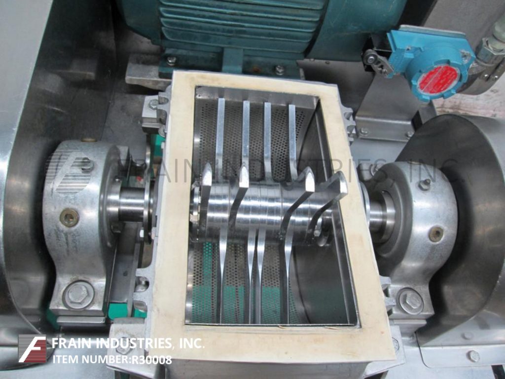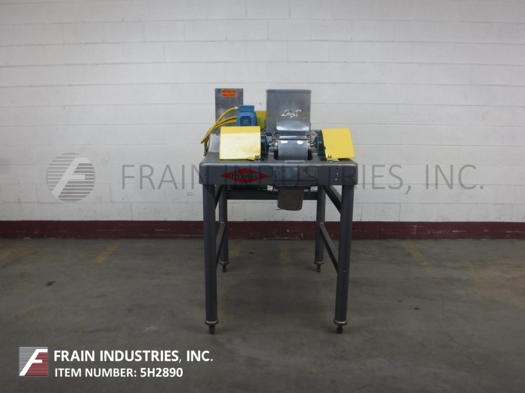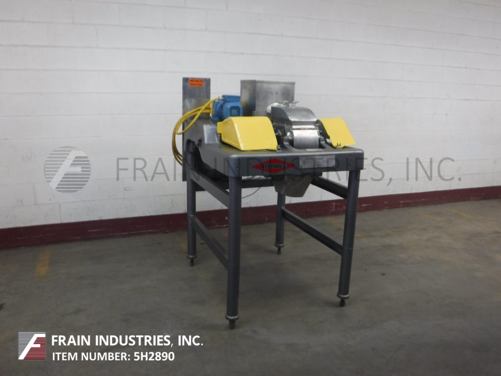 Fitzmill, Model DAS06, stainless steel hammer mill. with pounds of product per hour – depending on materials and application. Equipped with 12" long x 12" wide x 12" deep (½ ft³) product hopper, 4" diameter feed screw with 2" centers powered by ¾ HP drive and (26) 4" long x 3" wide fixed knife blades powered by a 15 hp drive. Product discharge is 9½”L x 6” W with 31" of ground clearance. Mounted on (4) leg painted frame base.