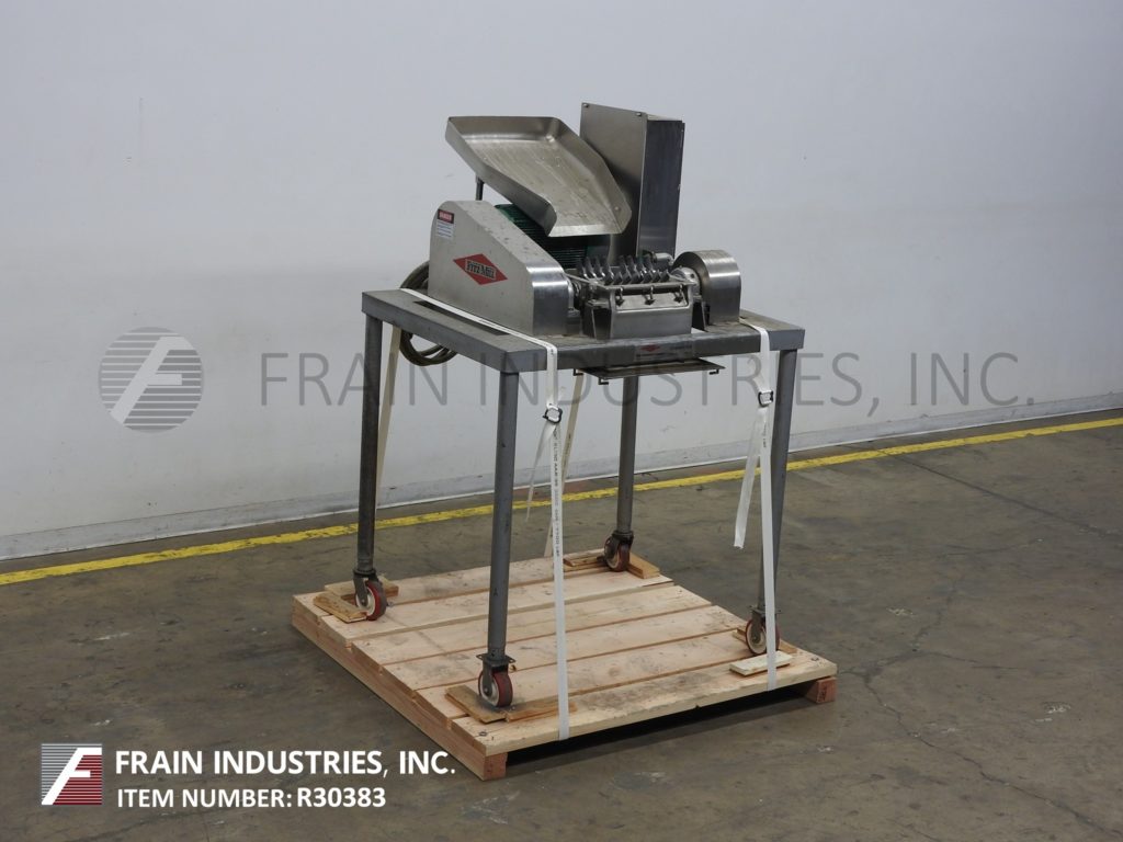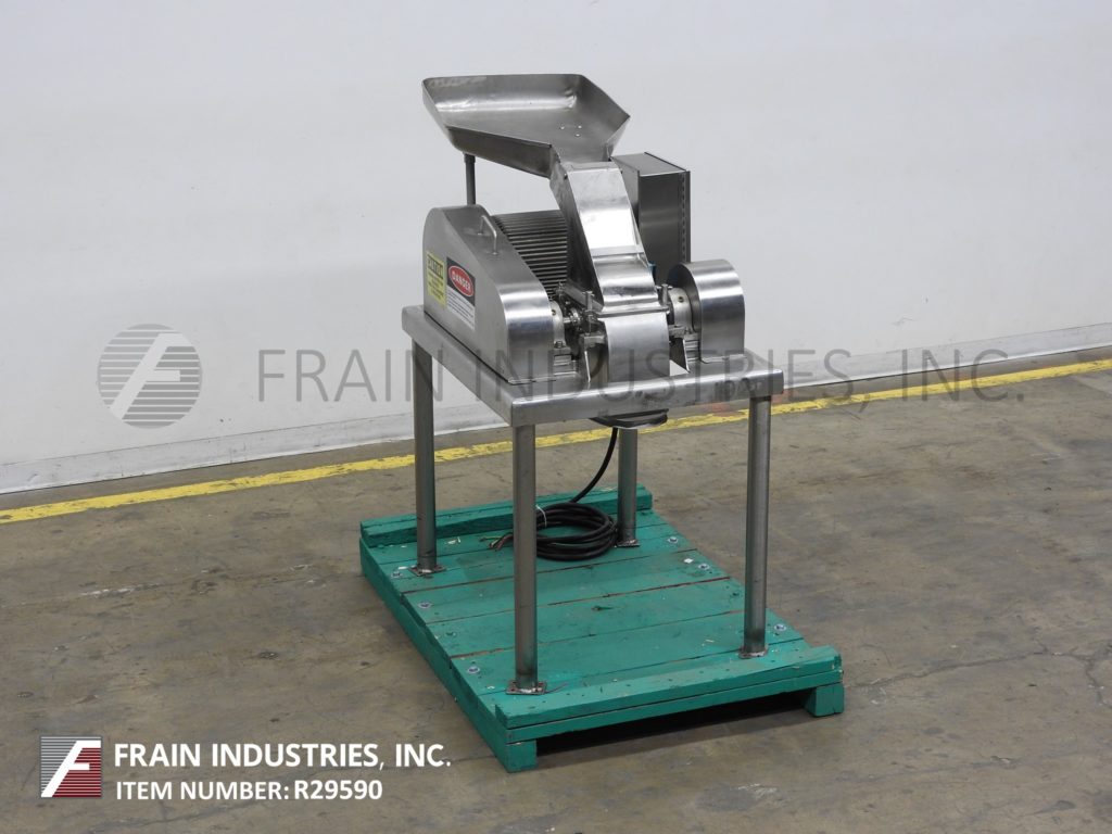 Fitzmill, Model DKAS012, stainless steel hammer mill with pounds of product per hour – depending on materials and application. Equipped with 20" wide x 24" long x 4" deep feed pan, (32) 3" long x 1½" wide fixed knife blades and 12" x 15" discharge with 45" of ground clearance. Mounted on (4) leg stainless steel frame with casters