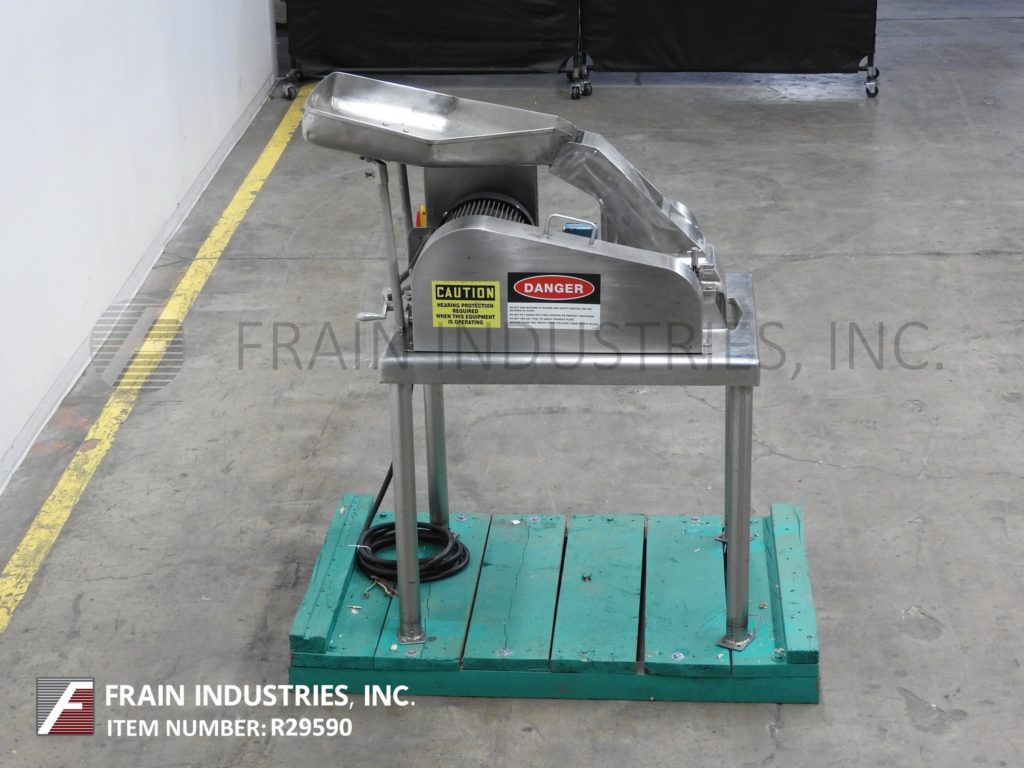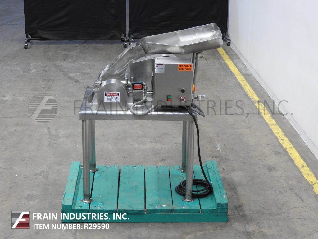 Quadro Model 197, 316 stainless steel particle size reduction Comil. Rated from 360 to 800 lbs of product per hour – depending on materials and application. Equipped with 10" diameter x 6" deep stainless steel product hopper, 3" diameter feed throat, 5" diameter screen and 6" diameter discharge port with 13" ground clearance. Mounted on stainless steel (4) leg base frame with variable speed control.