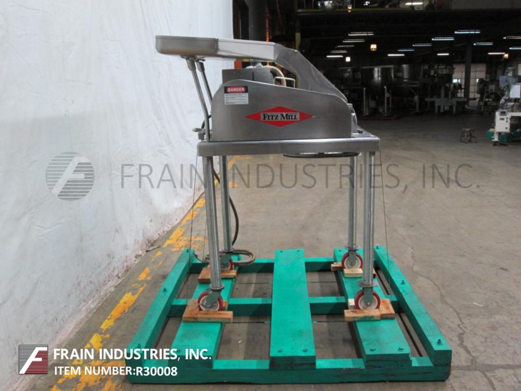 Fitzmill, Model DAS06, stainless steel hammer mill with pounds of product per hour – depending on materials and application. Equipped with 20" wide x 20" long x 4" deep feed pan, (16) fixed knife / impact blades and 15" x 5" discharge with 32" of ground clearance. Mounted on (4) leg stainless steel frame with casters.