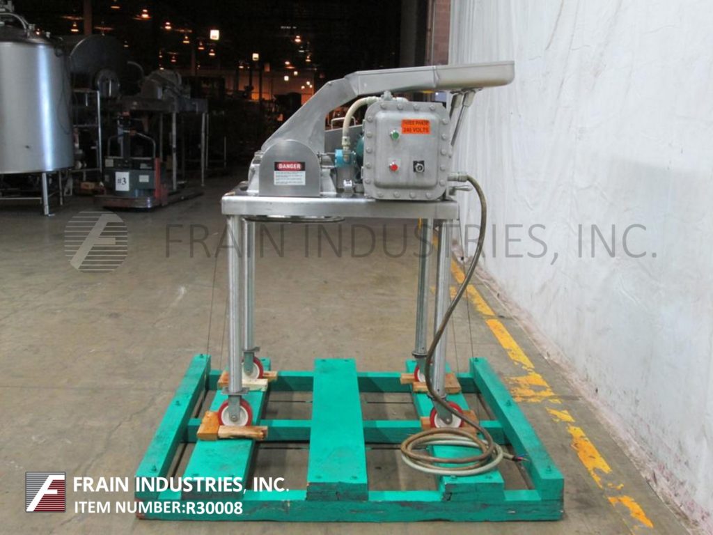 Fitzpatrick, Model JT, stainless steel homoloid mill. with production rates per minute – depending on materials, application and machine configuration. Equipped with 15" diameter x 10" deep feed hopper with 3" diameter feed throat, (15) fixed knife blades and 10" long x 6" wide bottom product discharge with 21” ground clearance. Push button start / stop controls. Mounted on stainless steel base frame with casters.
