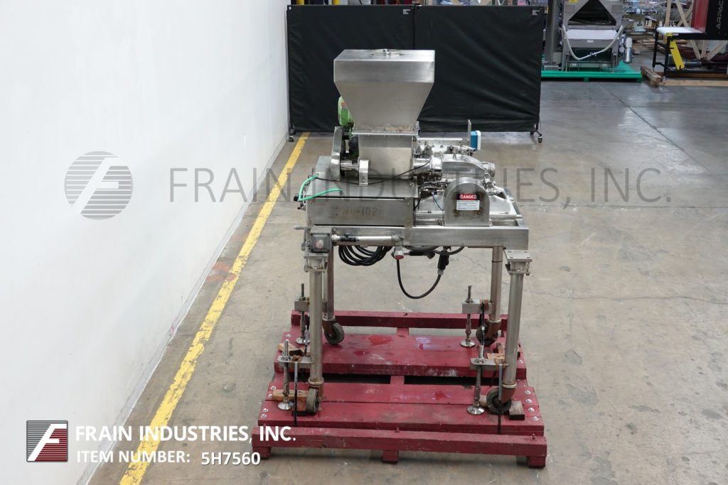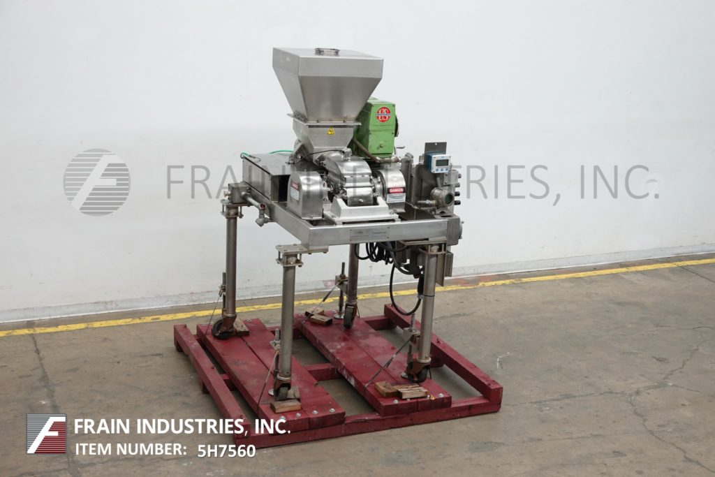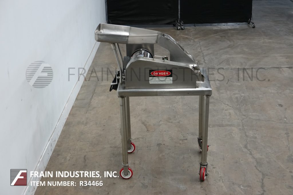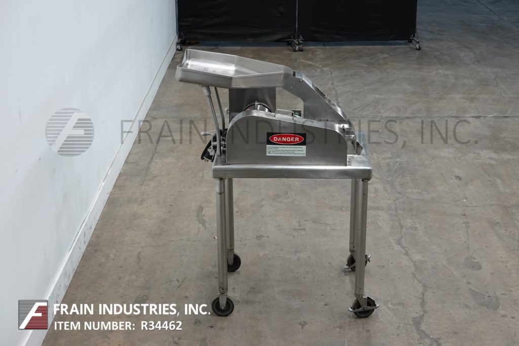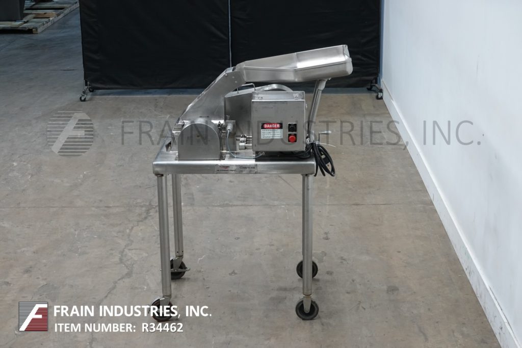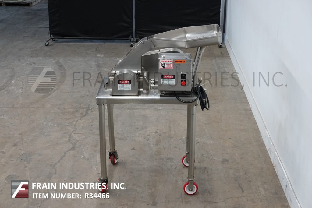 Fitzmill, Model DAS06, stainless steel hammer mill with production rates per hour – depending on materials, application and machine configuration. Equipped with 22" long x 22" wide x 17" deep hopper, 4" diameter feed auger powered by 1½ Hp drive with variable speed gearbox and (16) fixed knife/impact blades powered by 10 Hp motor drive and jacketed milling chamber. Product discharge is 10” long x 5½” wide with 40” floor clearance. Control panel with push button start / stop controls. Mounted on a stainless steel frame with casters.
