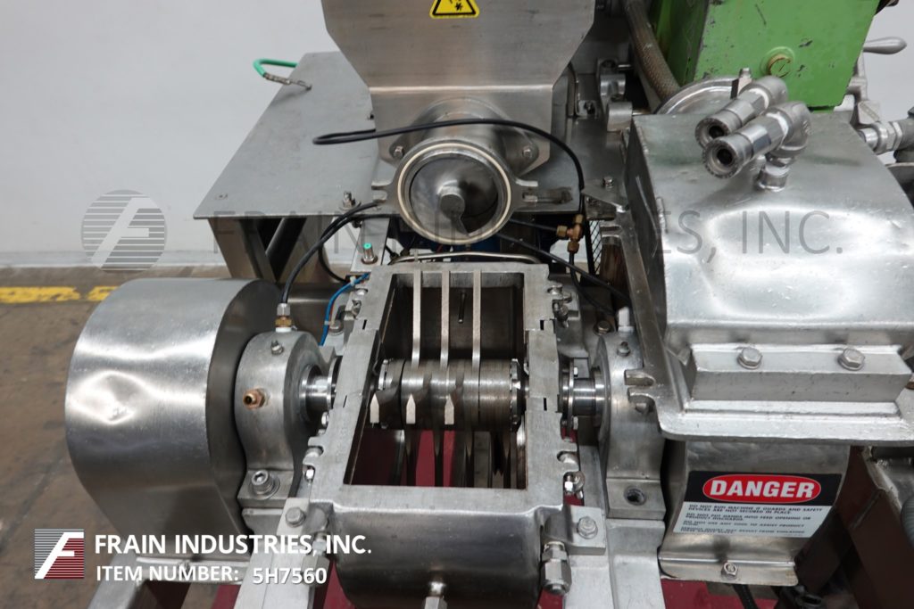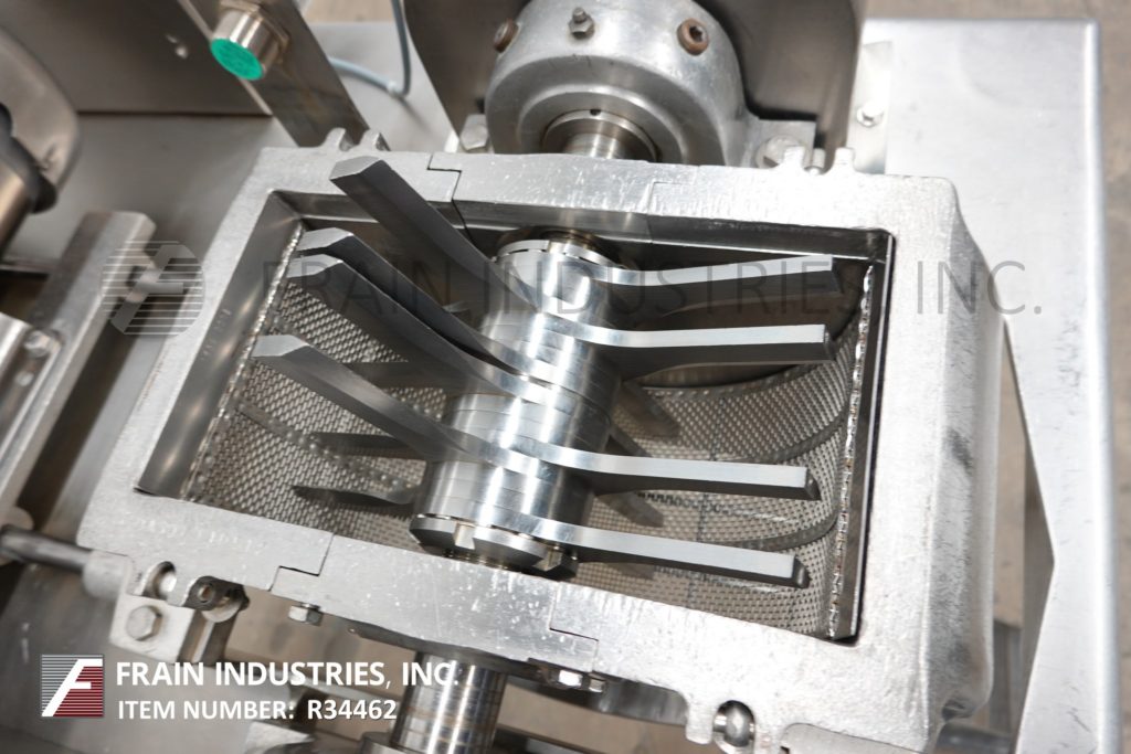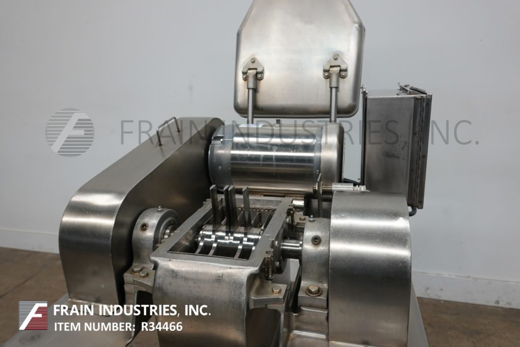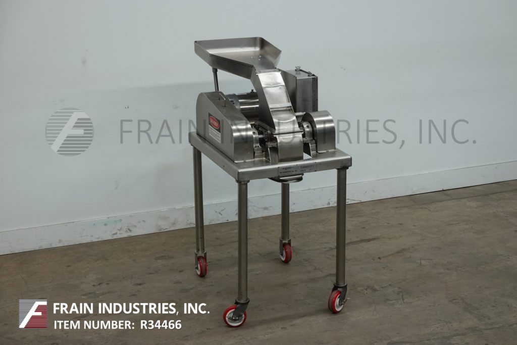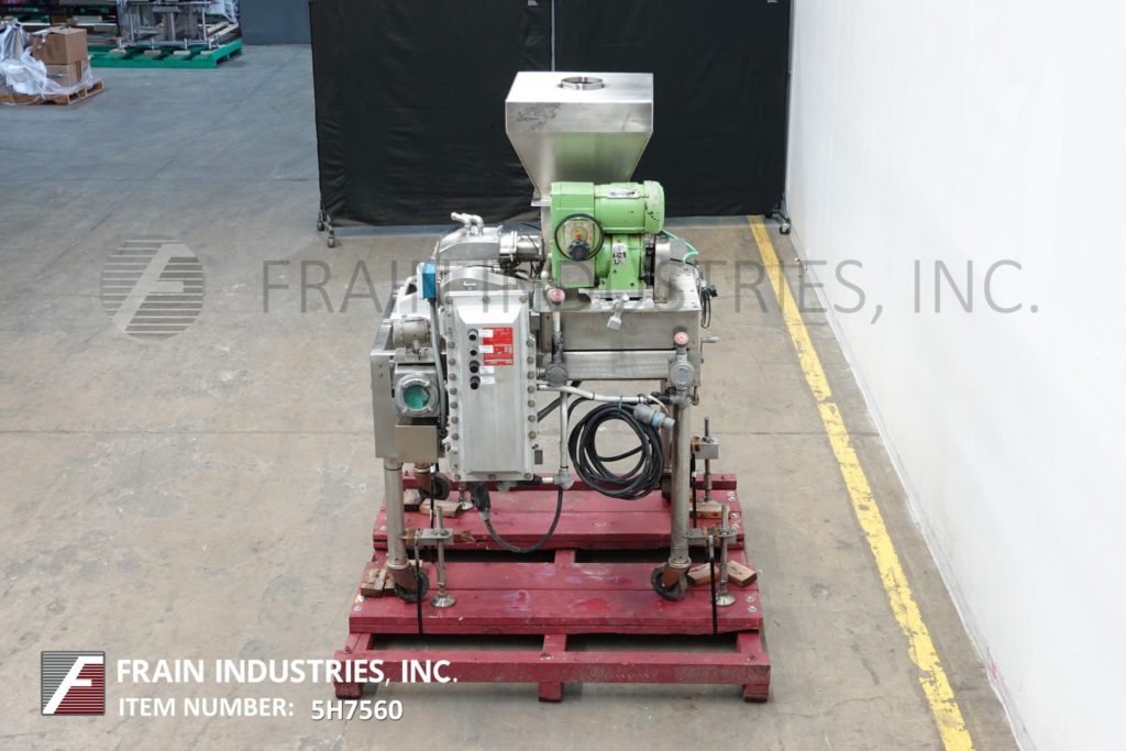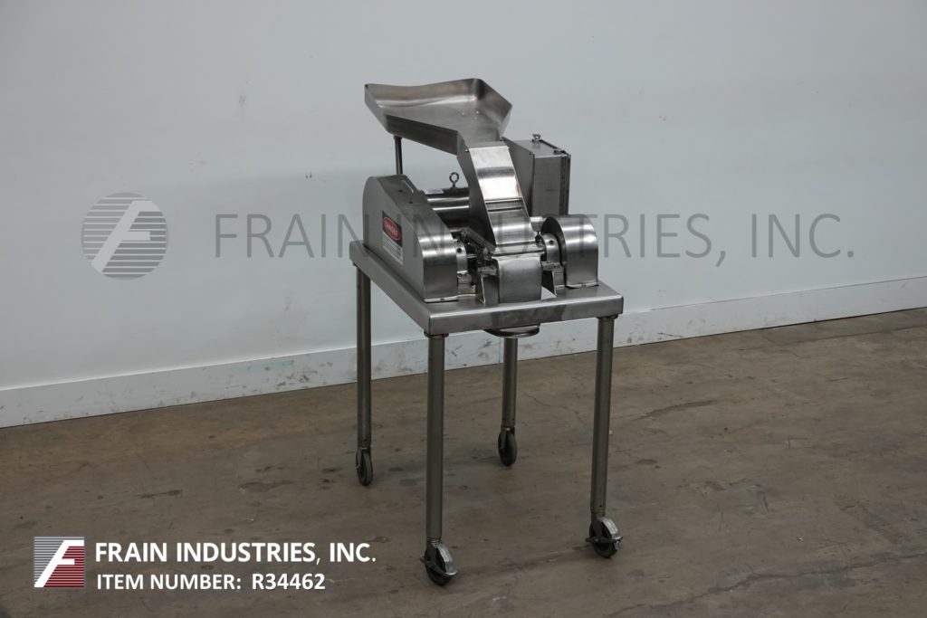 Fitzmill, Model DAS06, stainless steel hammer mill with production rates per hour – depending on materials, application and machine configuration. Equipped with 22" long x 22" wide x 17" deep hopper, 4" diameter feed auger powered by 1½ Hp drive with variable speed gearbox and (16) fixed knife/impact blades powered by 10 Hp motor drive and jacketed milling chamber. Product discharge is 10” long x 5½” wide with 40” floor clearance. Control panel with push button start / stop controls. Mounted on a stainless steel frame with casters.