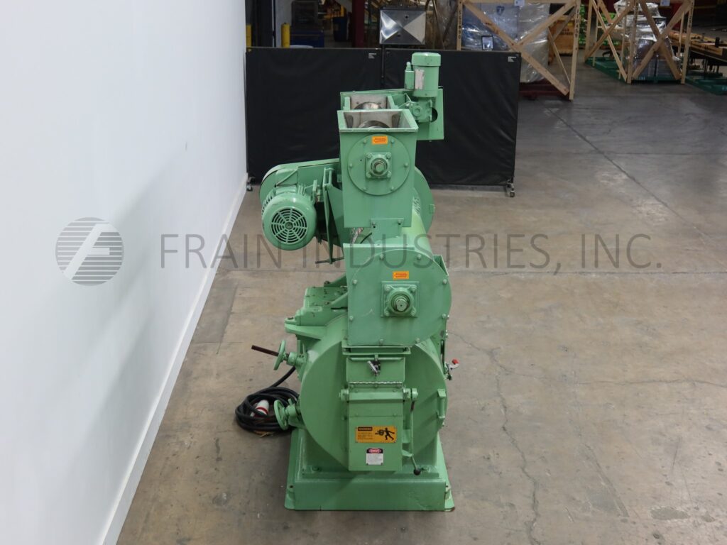 California Pellet Mill, Model 75C, pellet mill with amount of product per hour – depending on materials and application. Equipped with 24" long x 13" wide receiving port, 36" long auger feeder and powered by 2 HP drive into 38" long x 20" diameter continuous paddle mixer and conditioner powered by 25 hp drive and pellet mill chamber powered by 100 hp drive with 16" ID die with 226 in² working area.