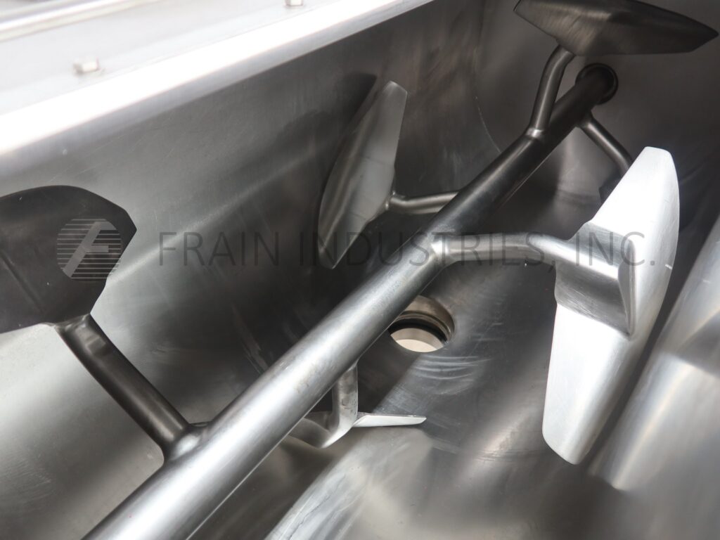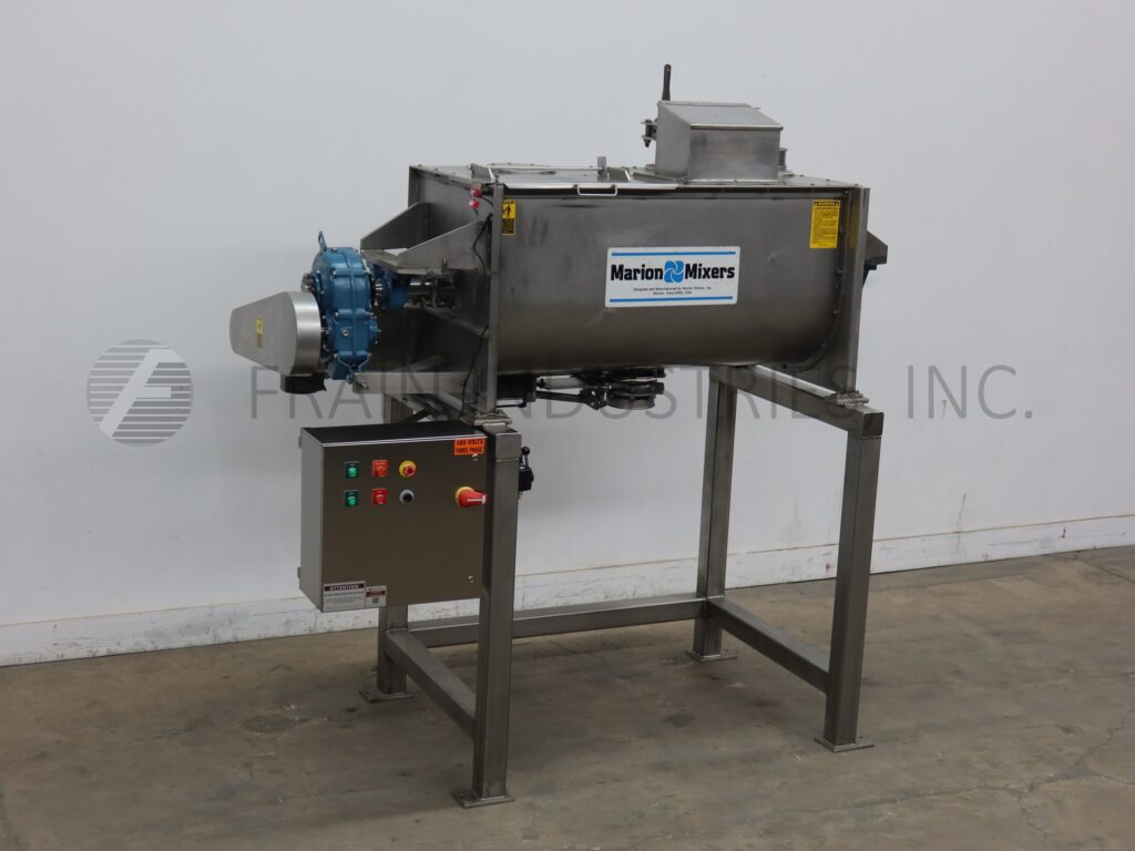 Marion, 25ft³ total (22ft³ working) capacity, 304 stainless steel paddle mixer with lbs of product per hour – depending on materials, application and machine configuration. Inner chamber dimensions: 60" in length x 27" in width x 30½" in depth. Equipped with a boltdown cover with a 12" long x 28" wide manway with liftup / clamp down cover, 3" diameter shaft with 17" long x 5½" wide paddles powered by a 10 HP motor. Bottom discharge with an 8" ID pneumatic slide gate valve.