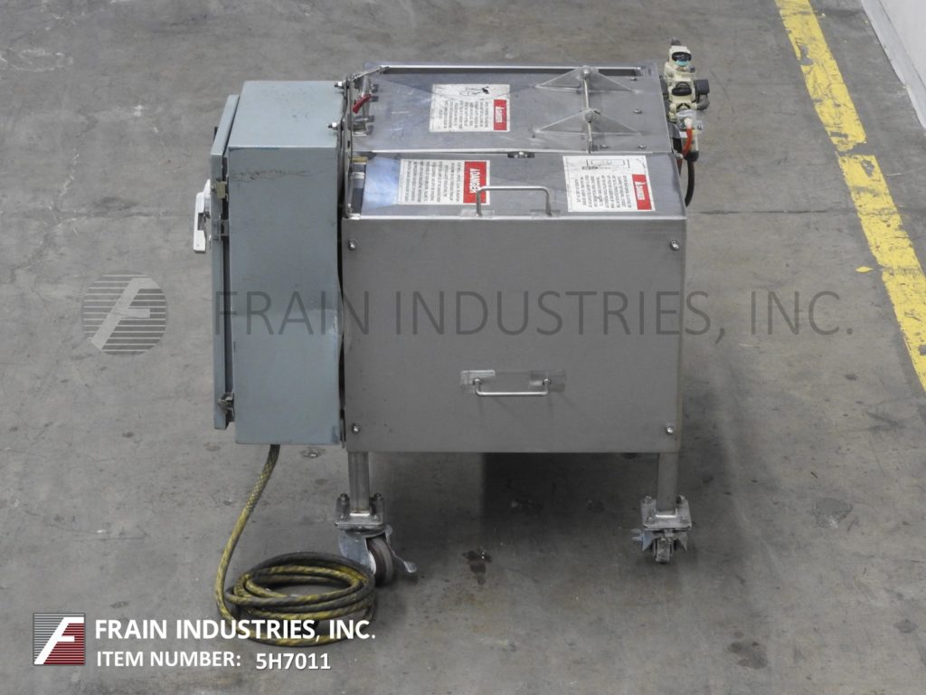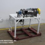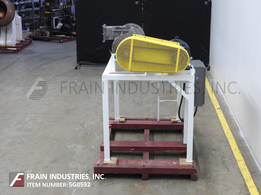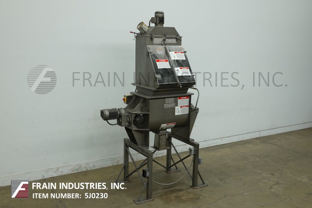 Marion, model BP4-2436-UW40, 10 ft³, 304 stainless steel paddle mixer with lbs of product per hour – depending on materials, application and machine configuration. Inner chamber dimensions: 36" in Length x 24" In Width x 29" in Depth. Equipped with 14" long x 14" wide clamp down cover with a 90" infeed height, 3" OD shaft with 14" long x 6" wide paddles powered by a 7½ hp drive, high speed chopper powered by a direct drive 10 hp motor, 4" diameter center bottom discharge with pneumatic slide gate valve and 47" floor clearance, EXPO Type Z MiniPurge Dust Protection for pressurizing control cabinet. Mounted on (4) leg painted frame.