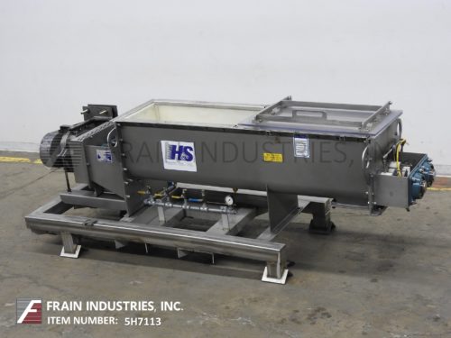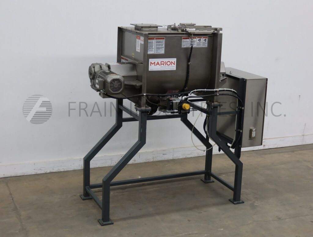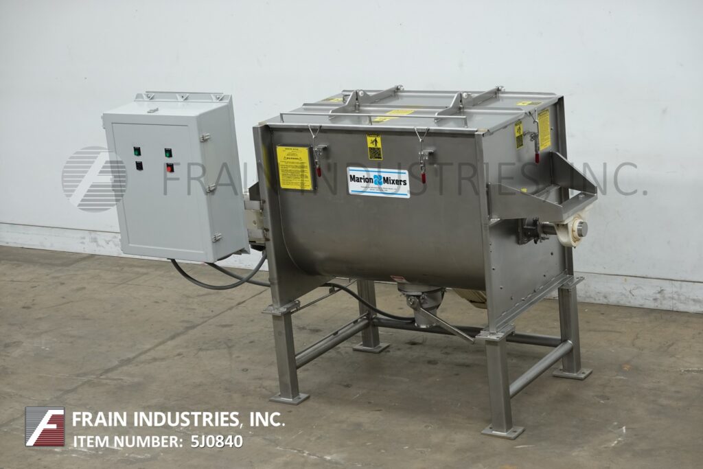 Marion, 25ft³ total (22ft³ working) capacity, 304 stainless steel paddle mixer with lbs of product per hour – depending on materials, application and machine configuration. Inner chamber dimensions: 60" in length x 27" in width x 30½" in depth. Equipped with a boltdown cover with a 12" long x 28" wide manway with liftup / clamp down cover, 3" diameter shaft with 17" long x 5½" wide paddles powered by a 10 HP motor. Bottom discharge with an 8" ID pneumatic slide gate valve.