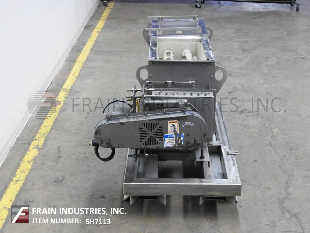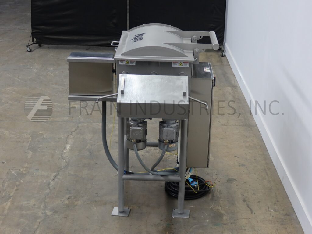 Mepaco, Model 170, 304 stainless steel dual trough paddle blender. Rated up to 250 lbs per batch. Capacity of: 8 ft³ (5 ft³ working). Trough dimesions: 41" in Length; 22" in Width; 16" in Depth. Equipped with lift up top cover, lift up safety grate, has 5" x 4" paddles and (2) 8" x 3" pneumatic end discharges with 42" ground clearance. Powered by 2 Hp motor drives. Control panel with AB controller and touch screen HMI. Mounted on (4) leg frame.