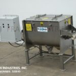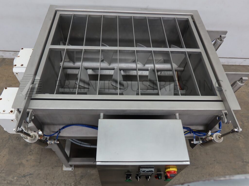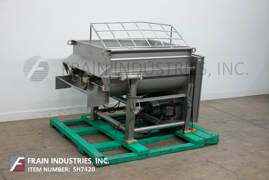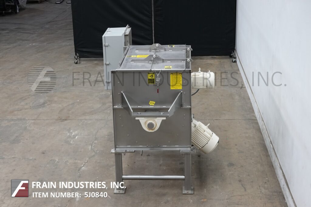 Model MB-23-60, 304 stainless steel, 48 ft³ total (32 ft³ workable), dual shaft mixer with pounds of product per hour – depending on materials and application. Inner chamber dimensions: 60" in Length; 46" in Width; 32" in Depth. Equipped with pneumatic lifting safety grate, (2) 4" OD shafts with 8¾" x 9" stainless steel paddles independently powered by 7½ Hp motor drives, (2) 19" wide x 7" high end discharges with pneumatic covers and 27" ground clearance. Control panel has push button start / stop, door open / close switches, digital timer and variable speed controls. Mounted on stainless steel (4) leg base frame.