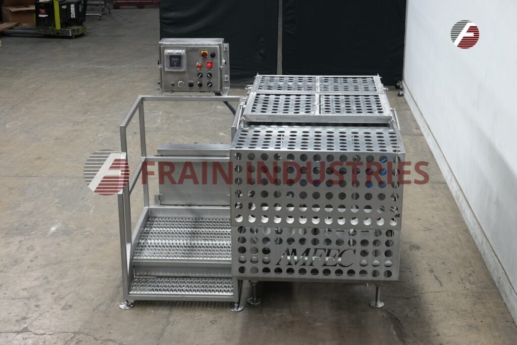 American Food Equipment Company, 304 stainless steel, 130 ft³ total (90 ft³ workable), dual shaft mixer with pounds of product per hour – depending on materials and application. Inner chamber dimensions: 102" in Length; 57" in Width; 42" in Depth. Equipped with mezzanine with a 24" wide x 119" long standing platform set 72" high with 41" high rails and 8-step staircase, pneumatic lift up safety grate, (2) shafts with 9" x 12" stainless steel paddles independently powered by 20 Hp motor drives, (2) 24" wide x 9½" high end discharges with pneumatic covers and 46" ground clearance. Discharges into a stainless steel funnel for cart loading.
