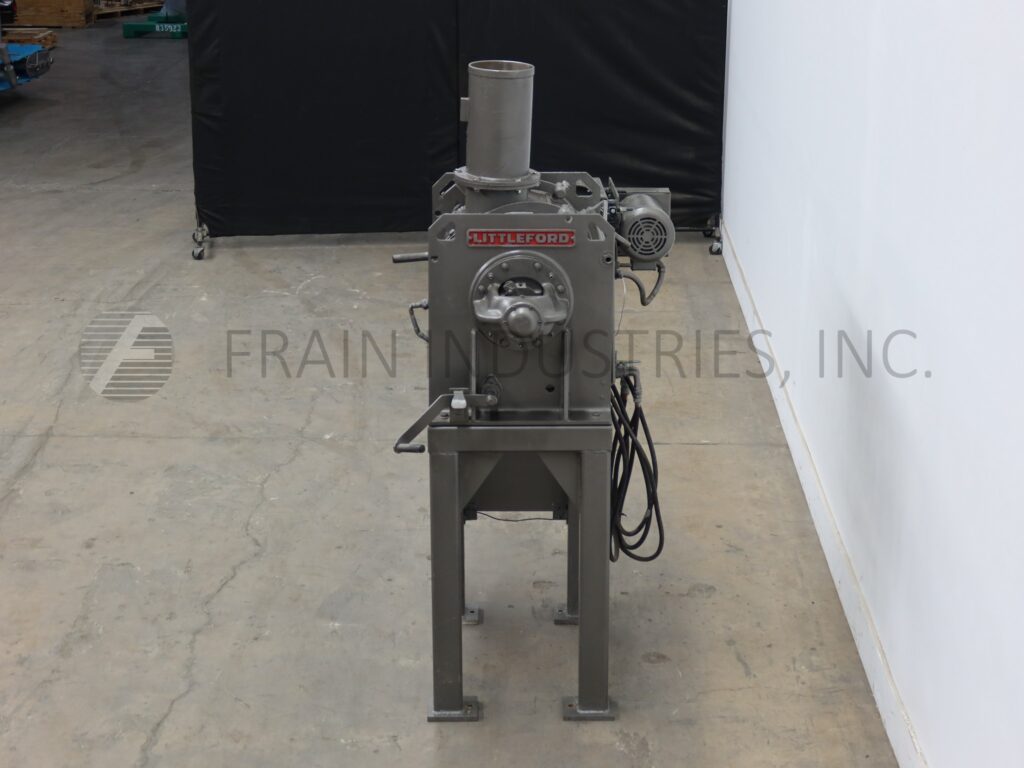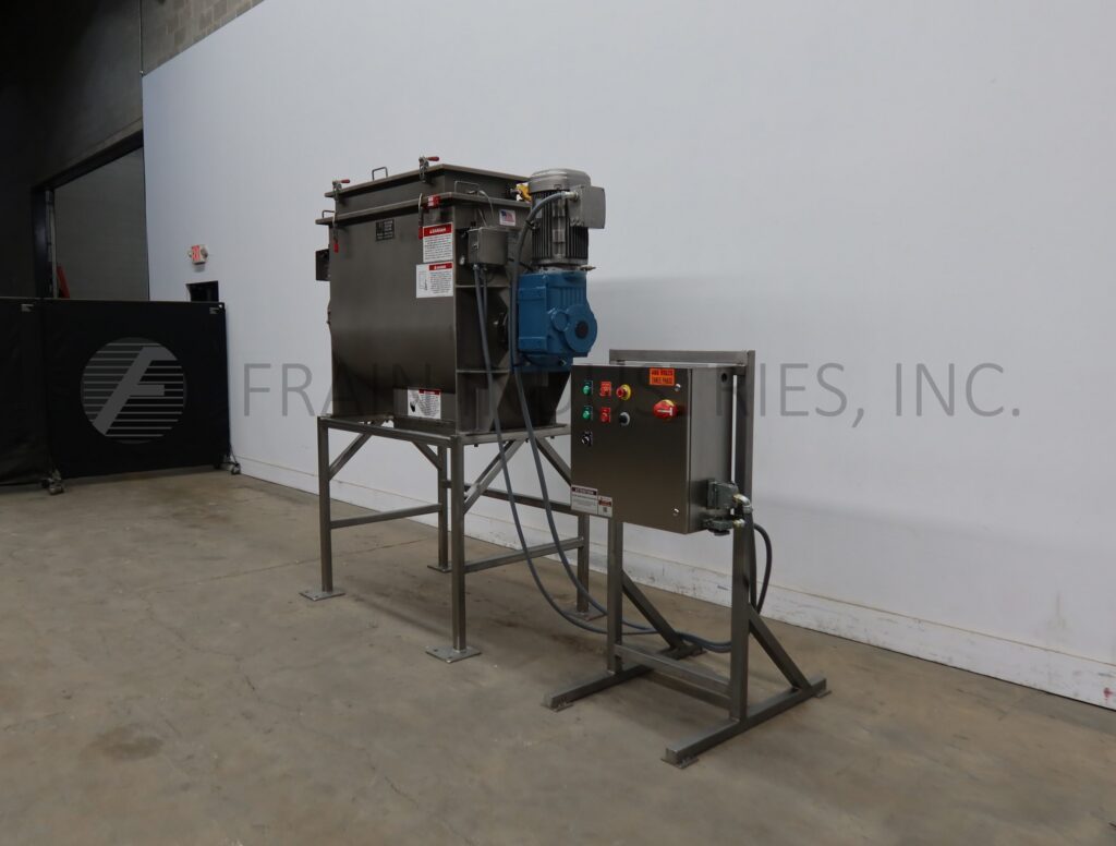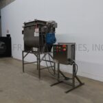 Littleford, Model FM-100, 3.3 FT³ capacity (2.1 FT³ working capacity) 304 stainless steel mixer. Equipped with a 20" diameter x 26" long chamber, lift up / clamp down manway with 10½"OD x 7¾"ID flanged charge port, paddles powered by a 5 HP drive and flush mounted discharge valve with 10" diameter port with 36" ground clearance.