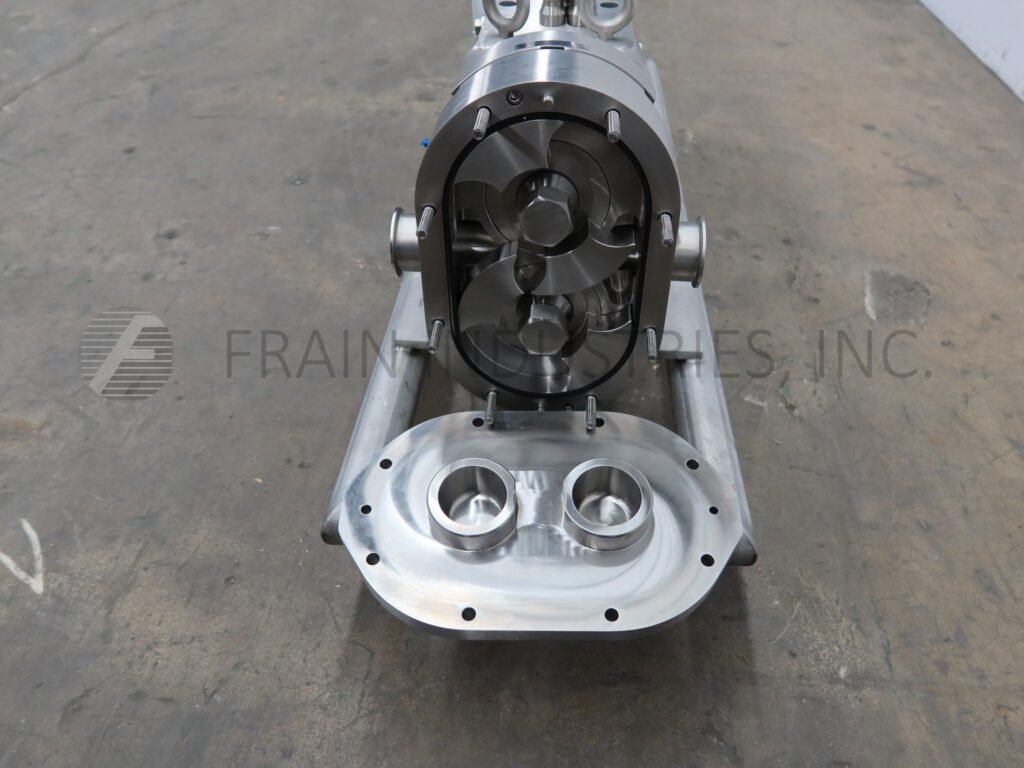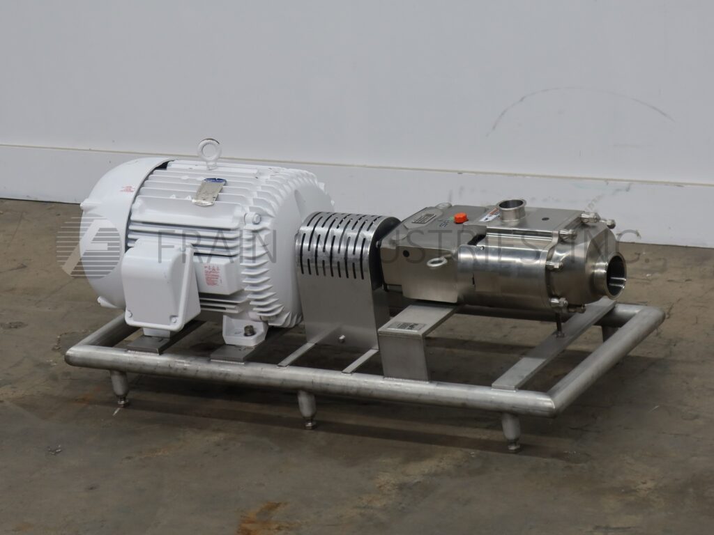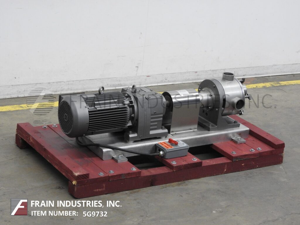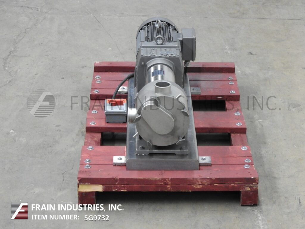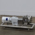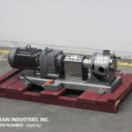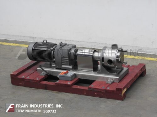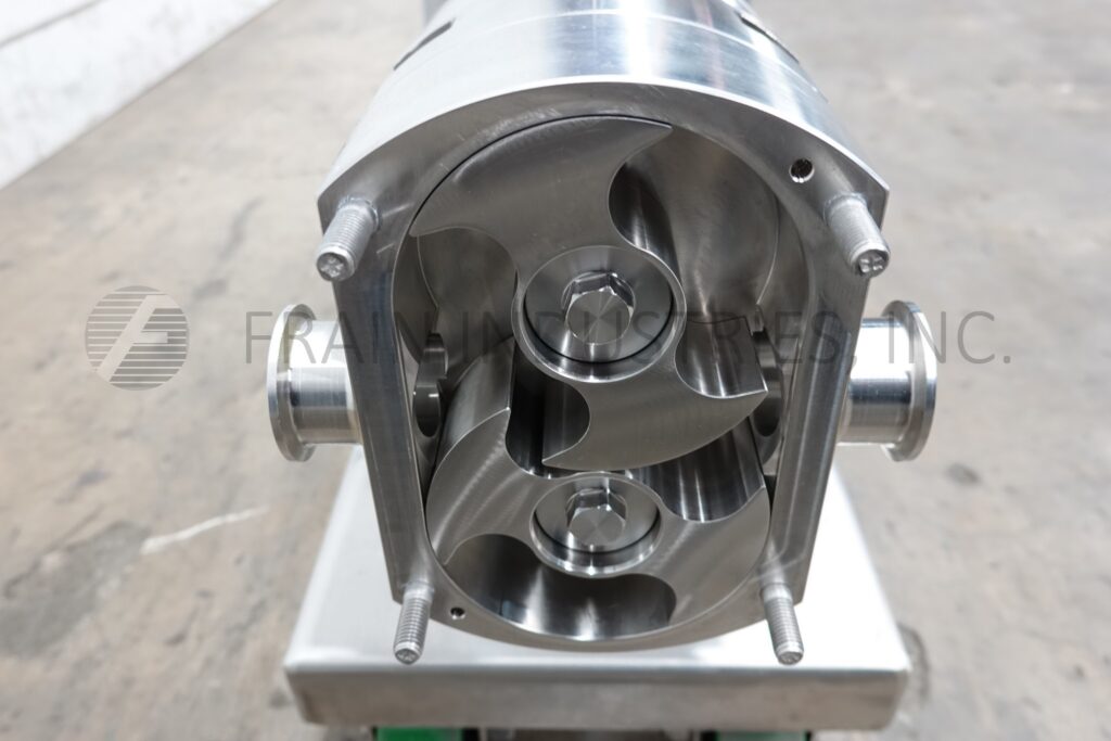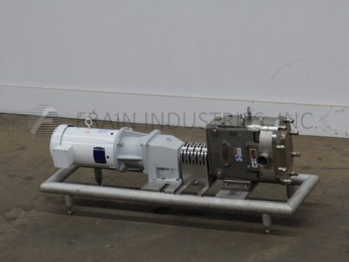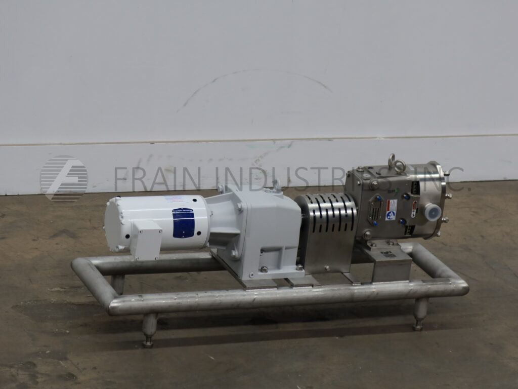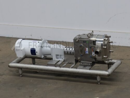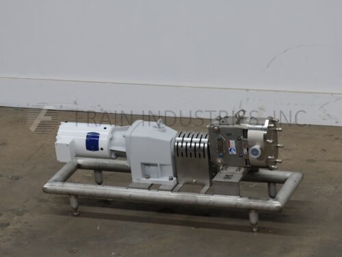 Waukesha, Model 45, positive displacement pump with 316 stainless steel contact parts. Rated from 1 to 58 gallons of product per minute – depending on materials, application and machine configuration. 450 psi maximum working pressure, temperature range of -40 Deg F to 200 deg f standard and up to 300 deg F with hot clearence rotors / stators and viton seals and capable operating both clockwise, or counter clockwise. Equipped with 2½" OD / 2" ID Tri-Clamp style product charge / discharge with 13½" ground clearance. Powered by 3 Hp motor drive with 5.79:1 gear ratio for a current rate of 29.79 gallons per minute.