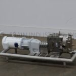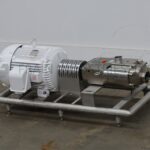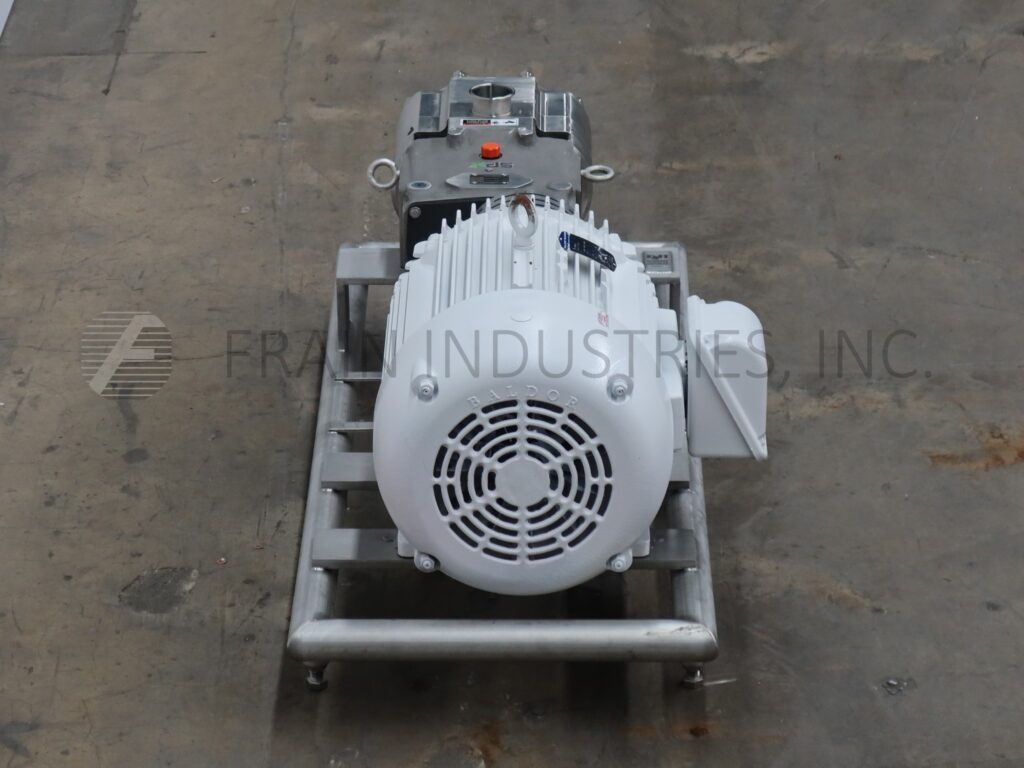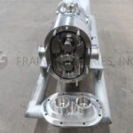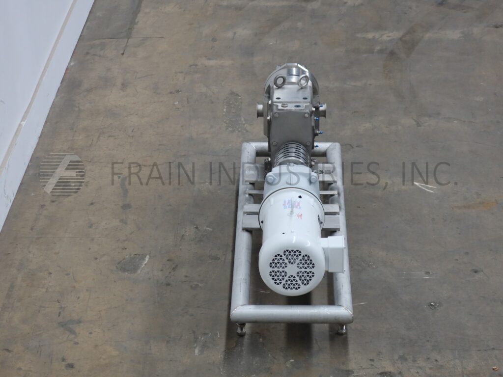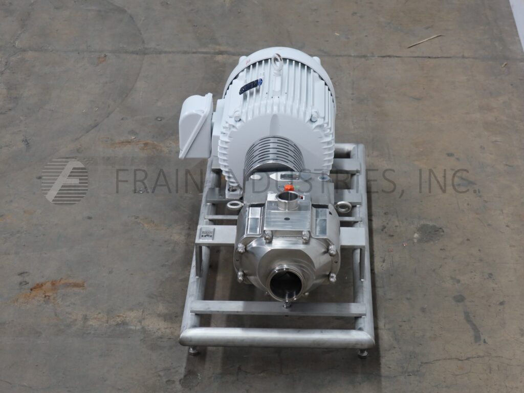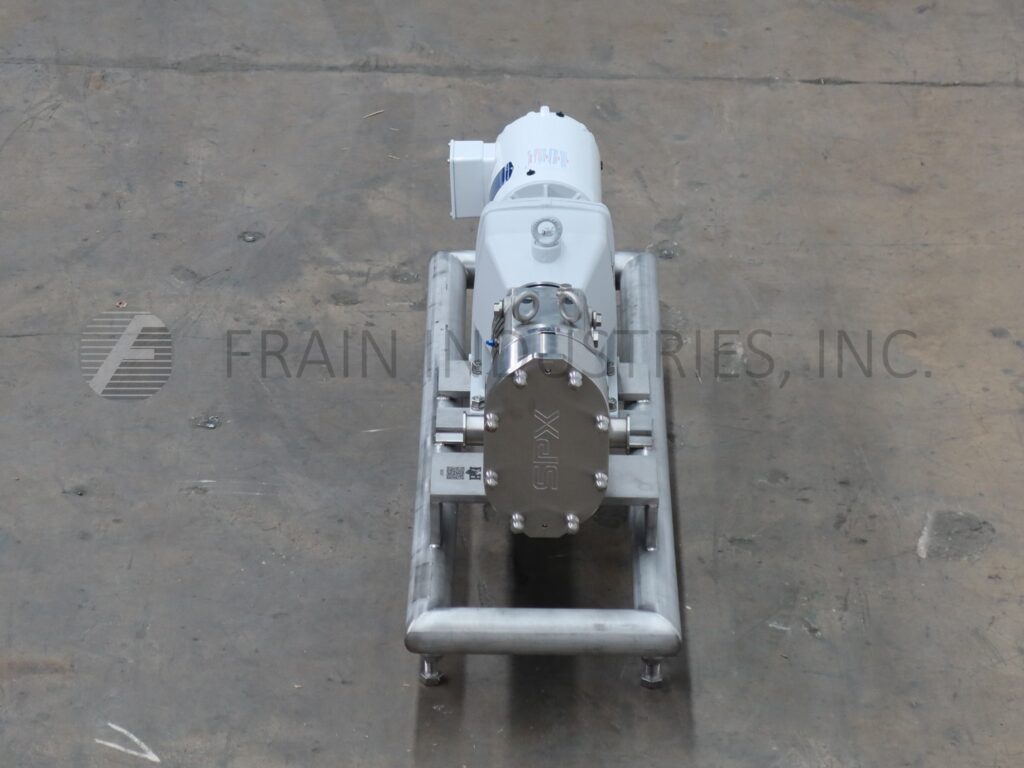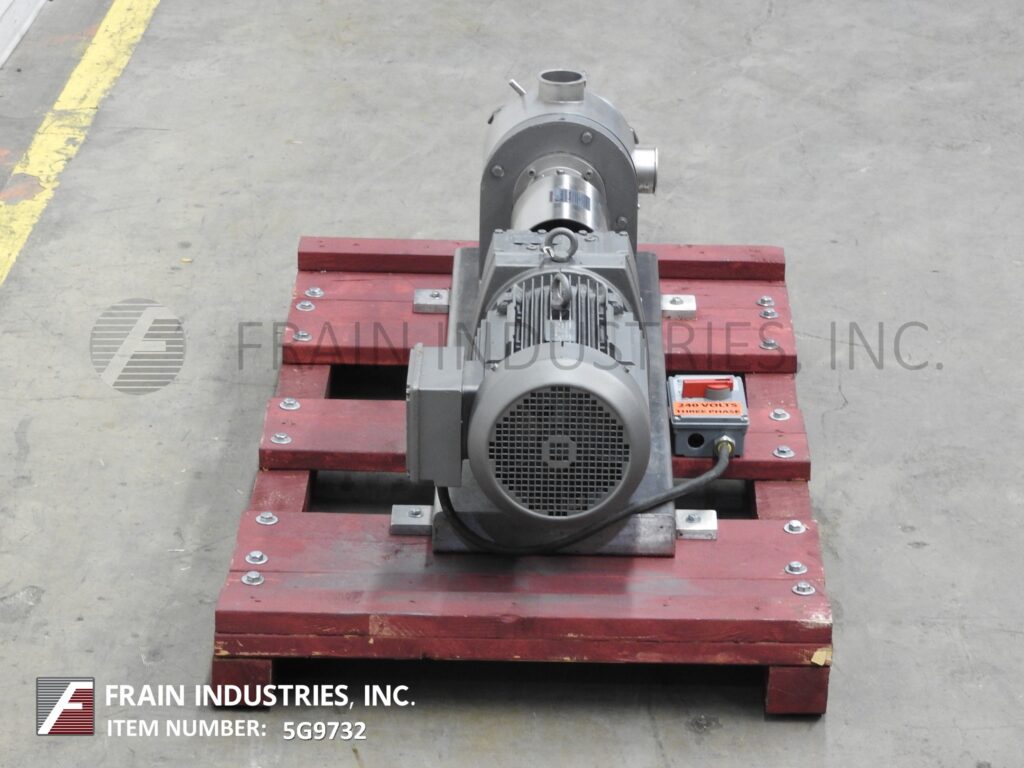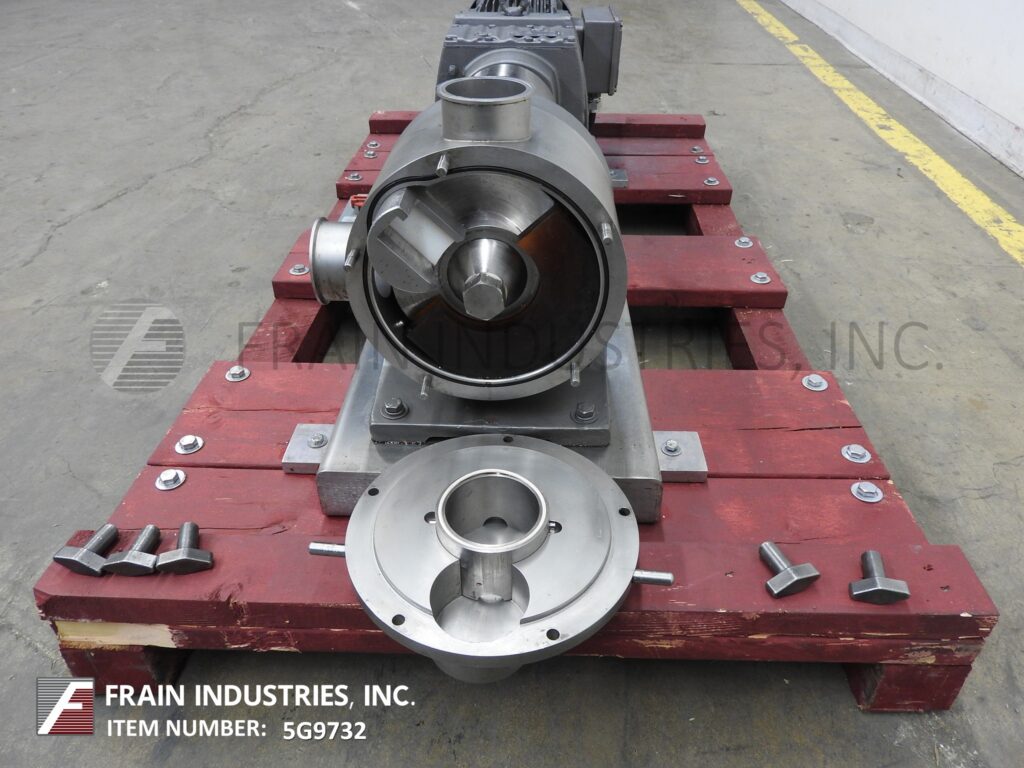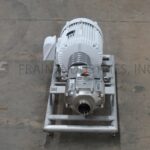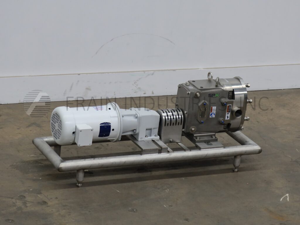 Waukesha, Model 45, positive displacement pump with 316 stainless steel contact parts. Rated from 1 to 58 gallons of product per minute – depending on materials, application and machine configuration. 450 psi maximum working pressure, temperature range of -40 Deg F to 200 deg f standard and up to 300 deg F with hot clearence rotors / stators and viton seals and capable operating both clockwise, or counter clockwise. Equipped with 2½" OD / 2" ID Tri-Clamp style product charge / discharge with 13½" ground clearance. Powered by 3 Hp motor drive with 5.79:1 gear ratio for a current rate of 29.79 gallons per minute.
