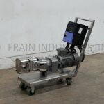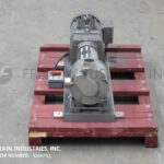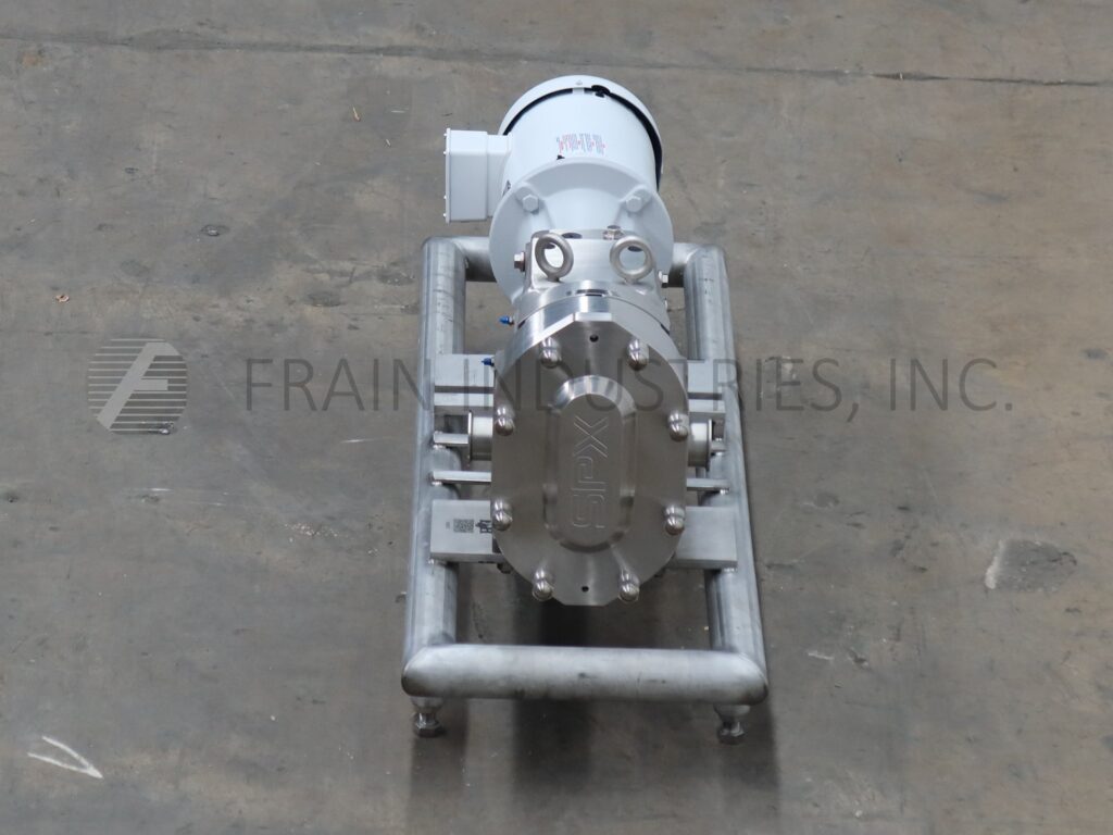 Waukesha, Model 45, positive displacement pump with 316 stainless steel contact parts. Rated from 1 to 58 gallons of product per minute – depending on materials, application and machine configuration. 450 psi maximum working pressure, temperature range of -40 Deg F to 200 deg f standard and up to 300 deg F with hot clearence rotors / stators and viton seals and capable operating both clockwise, or counter clockwise. Equipped with 2½" OD / 2" ID Tri-Clamp style product charge / discharge with 13½" ground clearance. Powered by 3 Hp motor drive with 10.89:1 gear ratio for a current rate of 15.79 gallons per minute.