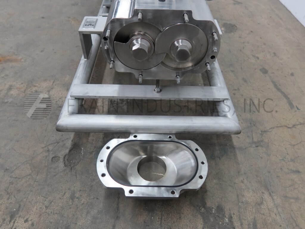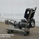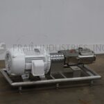 Sine, Model MR135-NNTC, stainless steel, sanitary, positive displacement pump. Rated from 0 to 138 gallons per minute – depending on materials, application and machine configuration. Can handle partculate sizes up to 1¼", temperature ranges from -40°F to 266°F, and pressure ratings up to150psi (10.3 bar). Equipped with 7" OD rotor, liners, scraper plate, 3½"OD / 2¾"ID Tri-clamp style inlet / outlets and wing bolt front cover. Powered by a 15 Hp motor drive with a 7.13:1 gearbox for a current pumping rate of 56 gpm. Mounted on a 48" long x 15" wide stainless steel base. Ideal for cheese, curd, whey, cottage cheese, fruit concentrates, frosting, slurries, soups, beef stew, syrups, chocolate, creams, lotions, shampoos and many more.