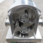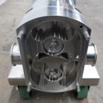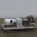 Waukesha, Model 30, positive displacement pump with 316 stainless steel contact parts. Rated from 1 to 36 gallons of product per minute – depending on materials, application and machine configuration. 450 psi maximum working pressure, temperature range of -40° F to 200° f standard and up to 300° F with hot clearence rotors / stators and viton seals and capable operating both clockwise, or counter clockwise. Equipped with 2" OD / 1½" ID Tri-Clamp style product charge / discharge with 14" ground clearance. Powered by 1½ Hp motor drive with 46.25:1 gear ratio for a current rate of 2.28 gallons per minute.