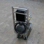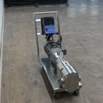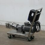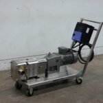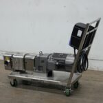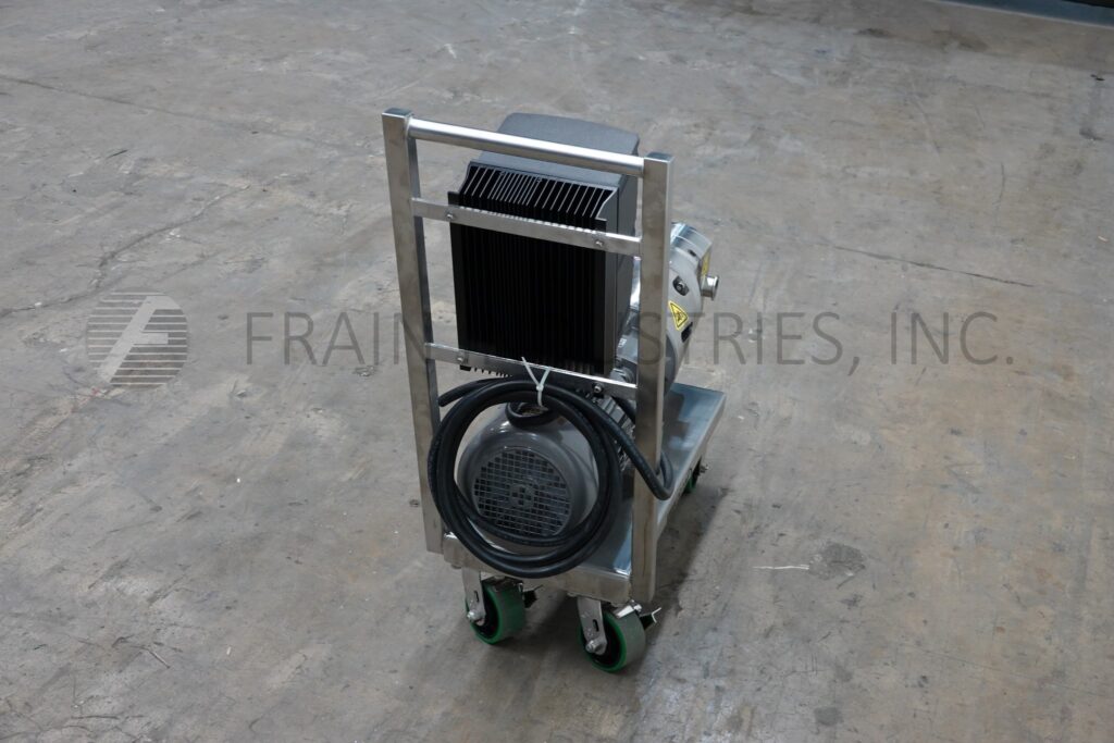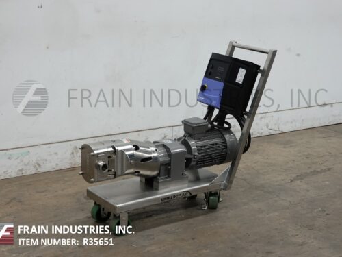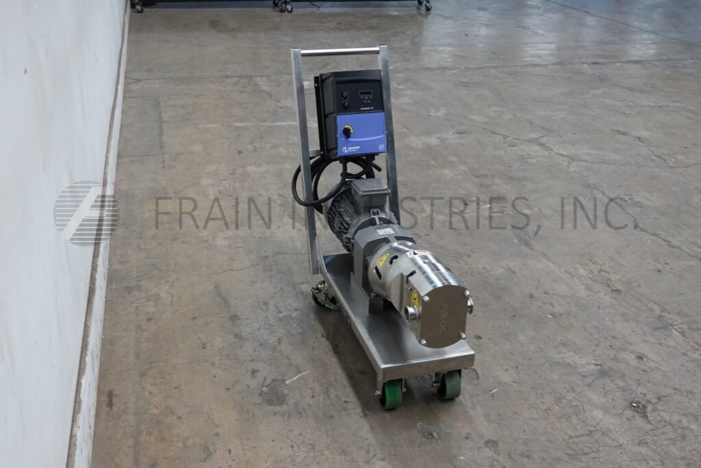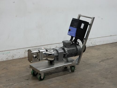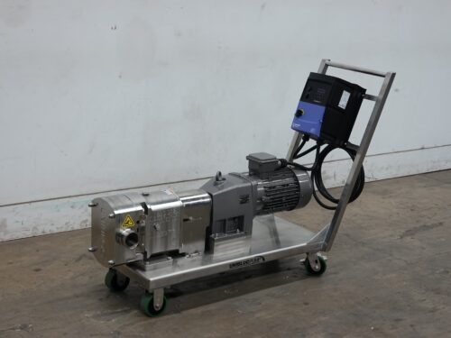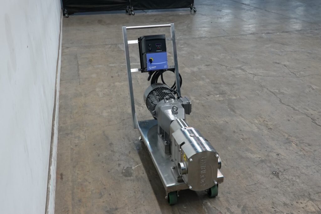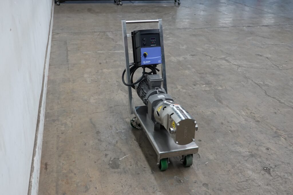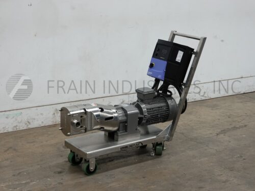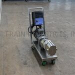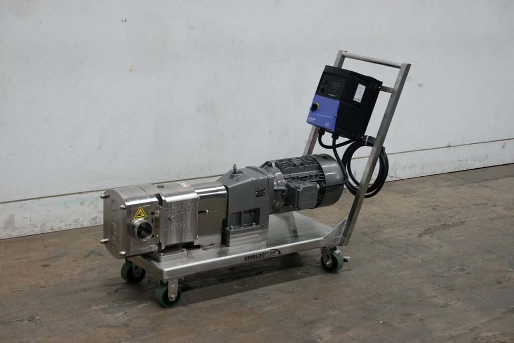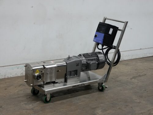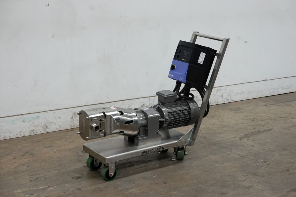 Unibloc, Model PD400, Positive displacement pump with 316 stainless steel contact parts. Rated from 5 to 50 gallons of product per minute – depending on materials, application and machine configuration. 500 psi maximum working pressure, temperature range of 400° F and capable operating both clockwise, or counter clockwise. Equipped with a 2" OD / 1½" ID Tri-clamp style product charge / discharge with 14" ground clearance and variable speed controller. Powered by a 5 Hp drive with a 4.22:1 gear ratio for a current maximum rate of 33.6 gallons @ minute. Mounted on a 30" long x 12" wide stainless steel cart with casters.
