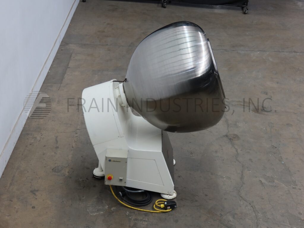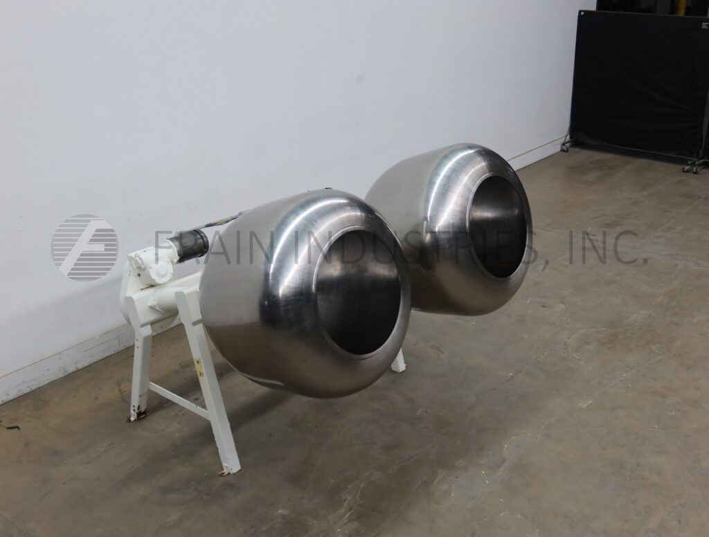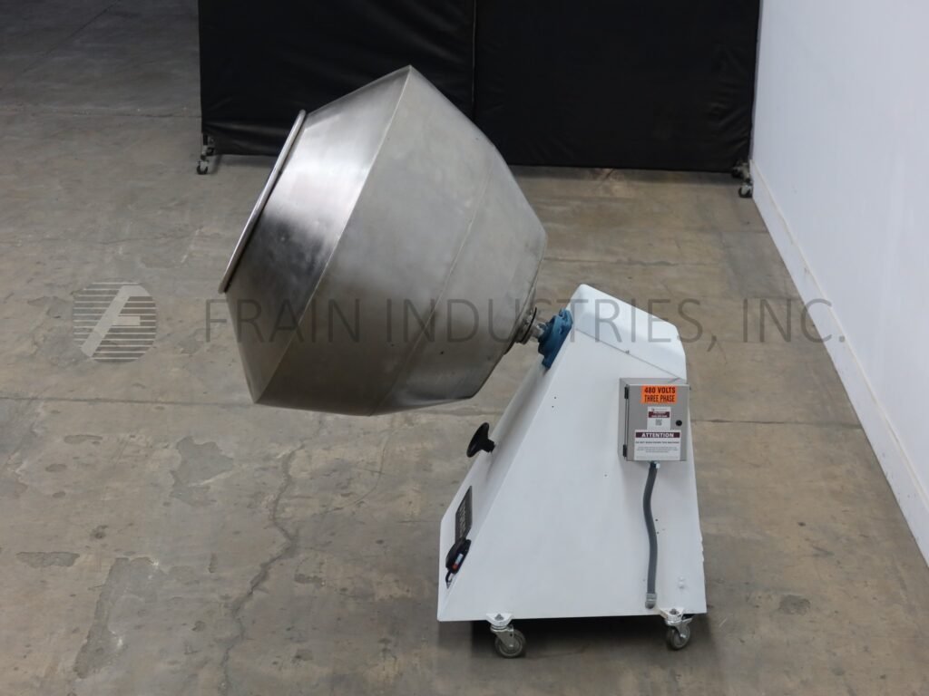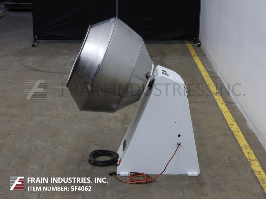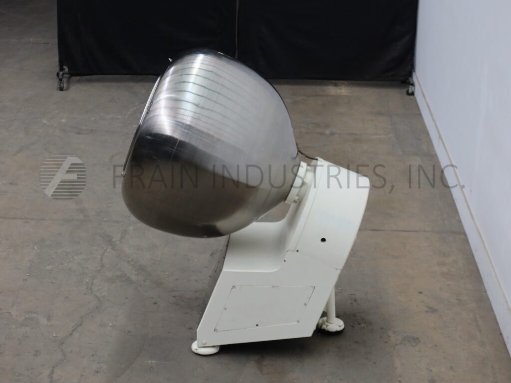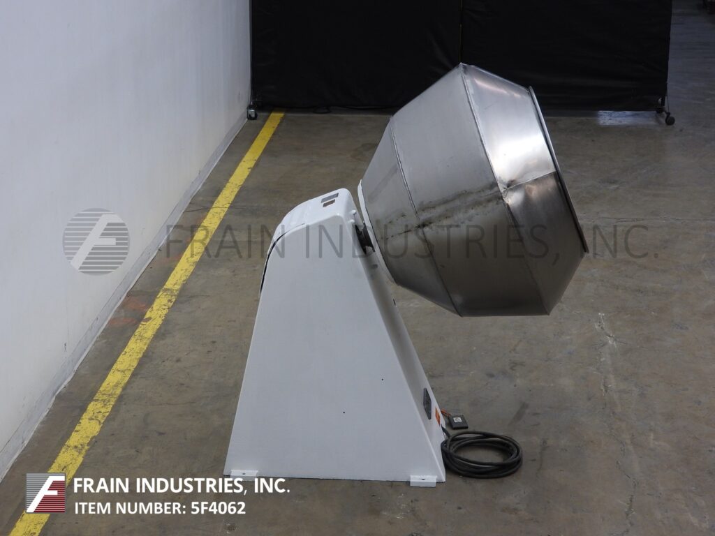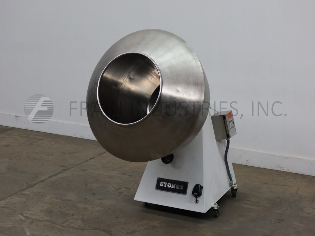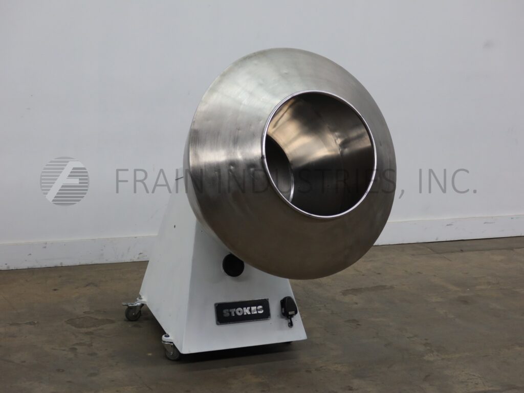 Stokes, 48" stainless steel, angular shaped, coating pan. Pounds of product per hour – depending on materials, application and operator dexterity. Equipped with 48" diameter x 36" deep coating bowl, 25" diameter product access port with 46" ground clearance and powered by a 2 Hp drive. Mounted on painted base frame.