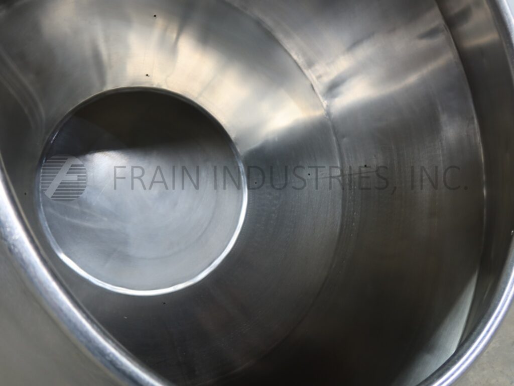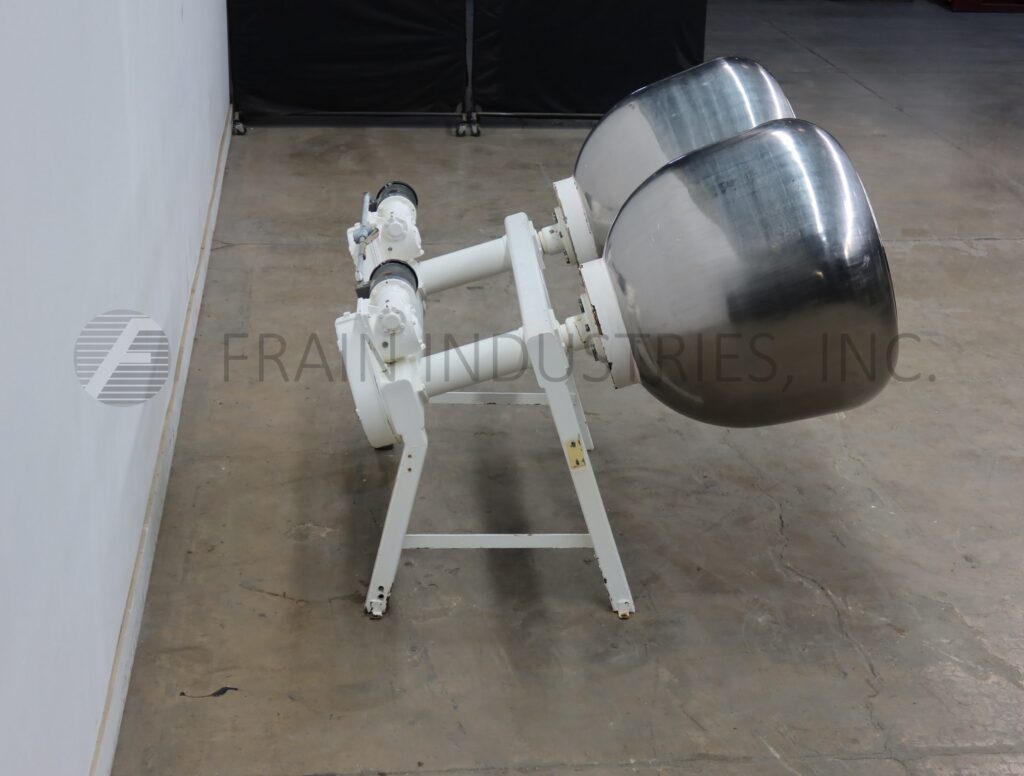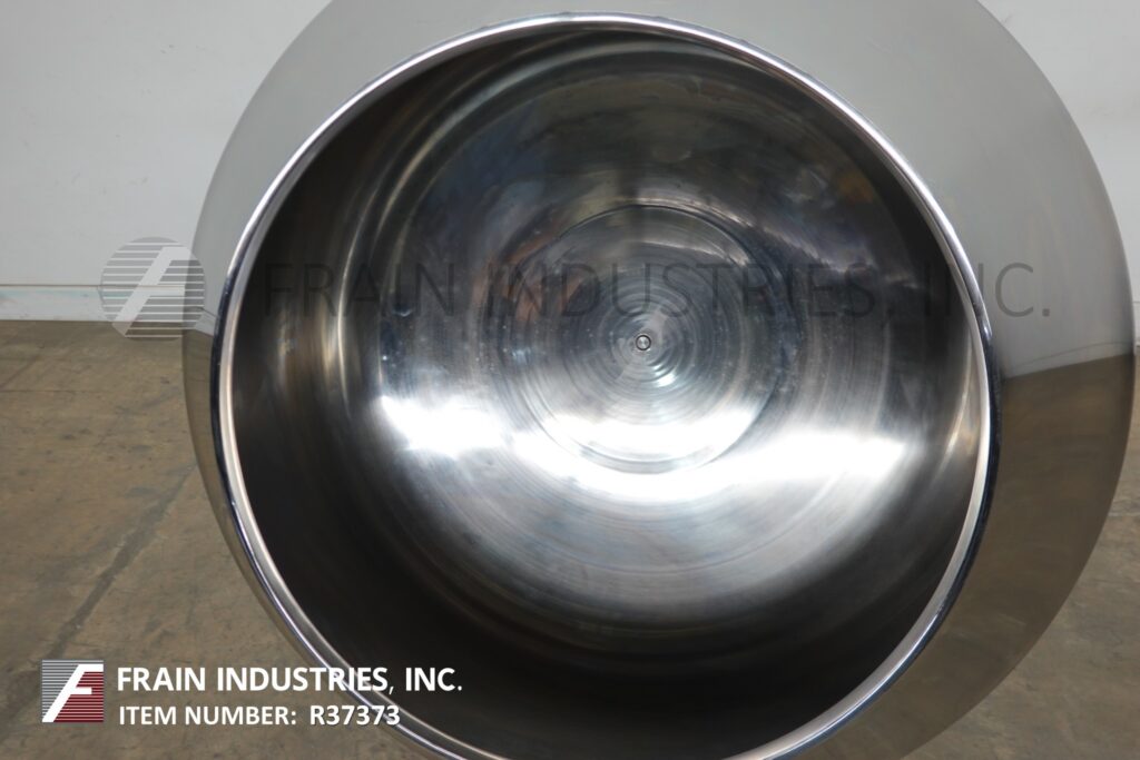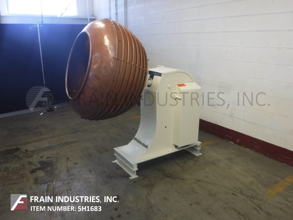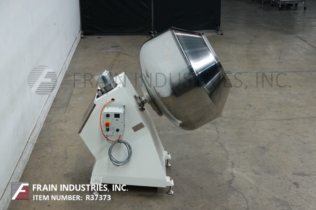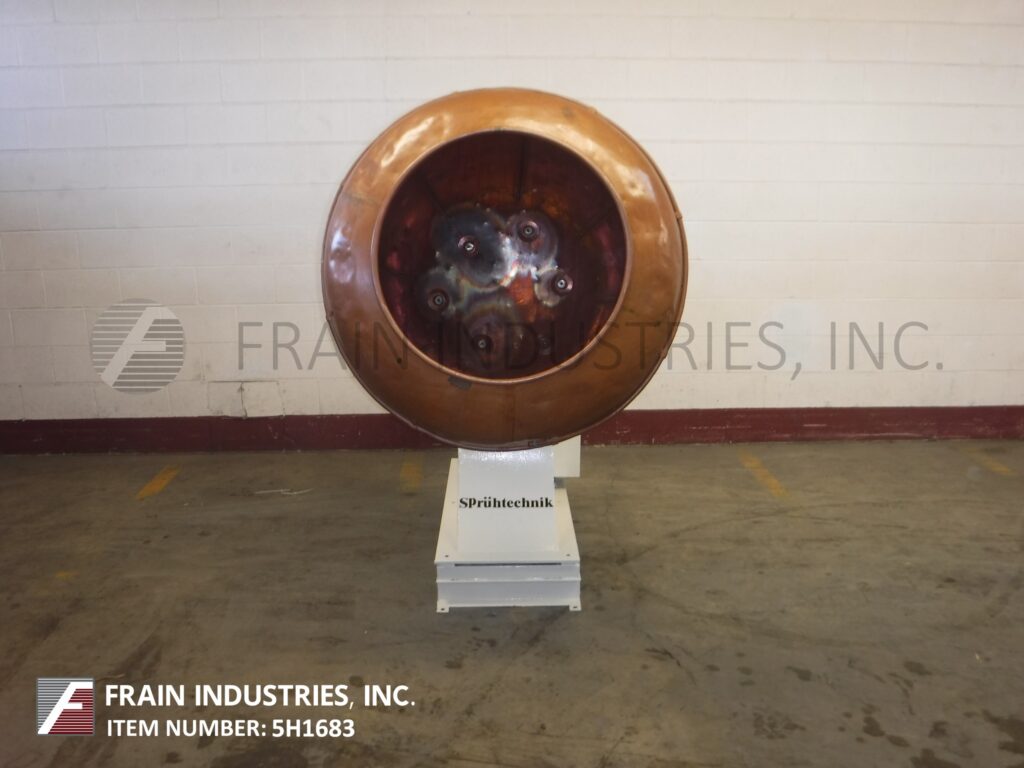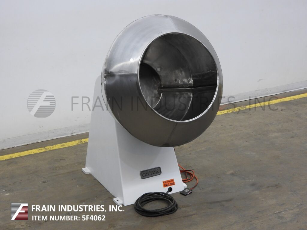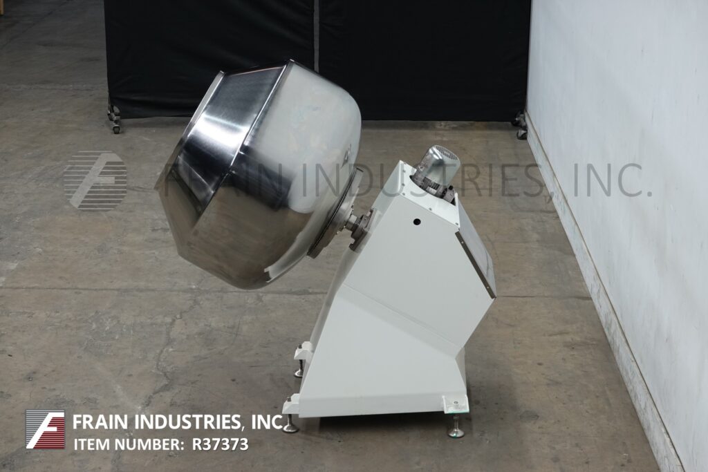 Stokes, 48" stainless steel, angular shaped, coating pan. Pounds of product per hour – depending on materials, application and operator dexterity. Equipped with 48" diameter x 36" deep coating bowl, 25" diameter product access port with 46" ground clearance and powered by a 2 Hp drive. Mounted on painted base frame.