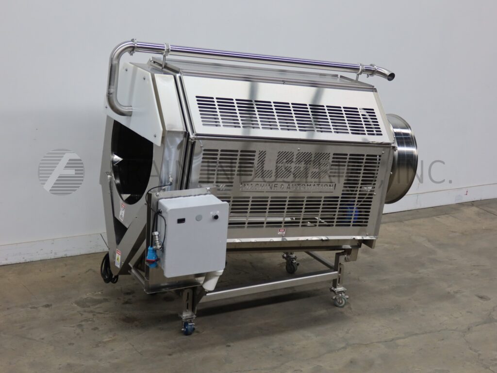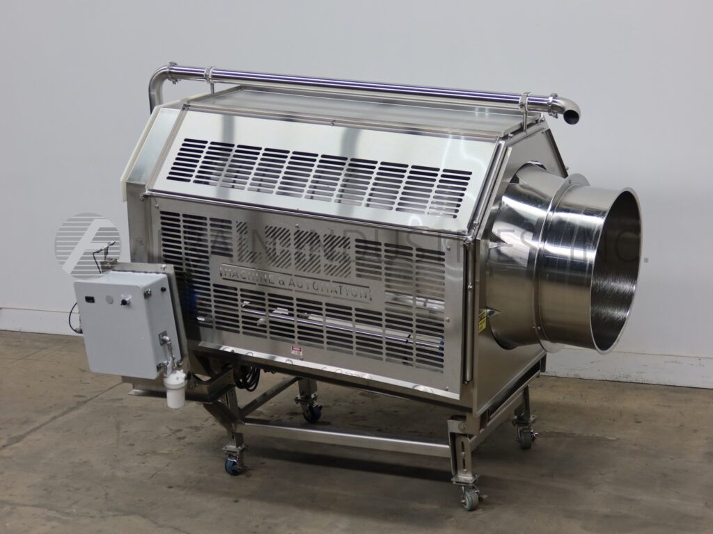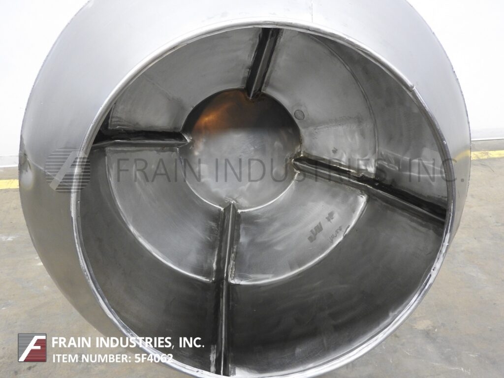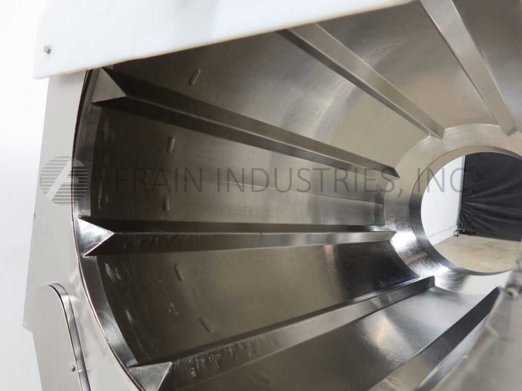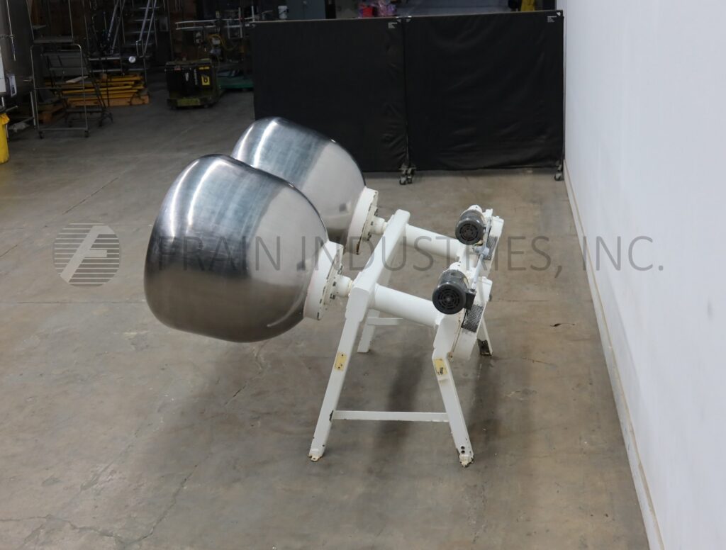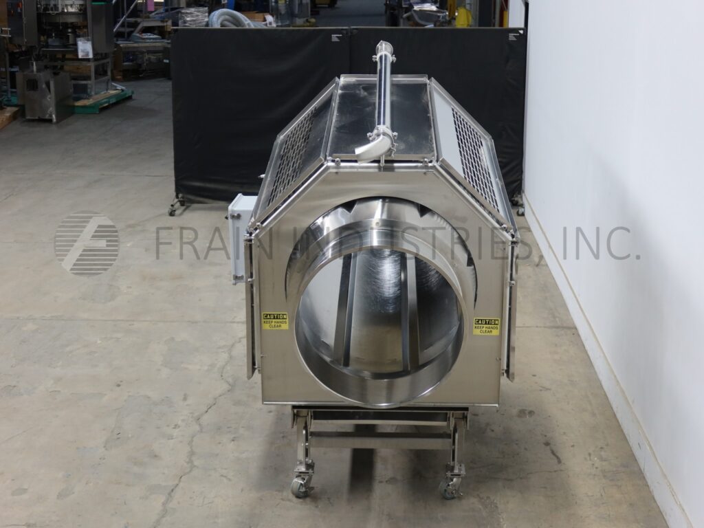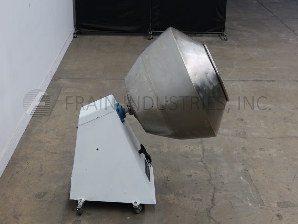 Loos Machine, 36" diameter, stainless steel, continuous motion coating drum with pounds of product per hour – depending on materials, application and machine configuration. Equipped with a 36" diameter x 96" long coating drum with (8) 2" wide fixed interior soft flight baffles, 2 Hp drum roller motor drive, 32" diameter charge port with a 39" in feed height and 30" diameter discharge with 28" discharge height.