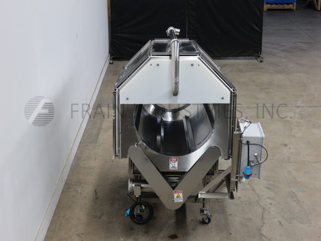 Foodesign / Spray Dynamic, Model QSD – 3072 – SD / 201, is a 29" OD, stainless steel, continuous motion coating drum with production rates per hour – depending on materials, application and machine configuration. Equipped with 29" OD x 78" long coating drum with (12) 2" wide fixed interior soft flight baffles 22" diameter charge, 24" diameter discharge at 35" high, Unispense dry ingrediants feeder and liquid spray system. Control panel has Unispence start, stop, enable buttons with speed controller and digital readout.