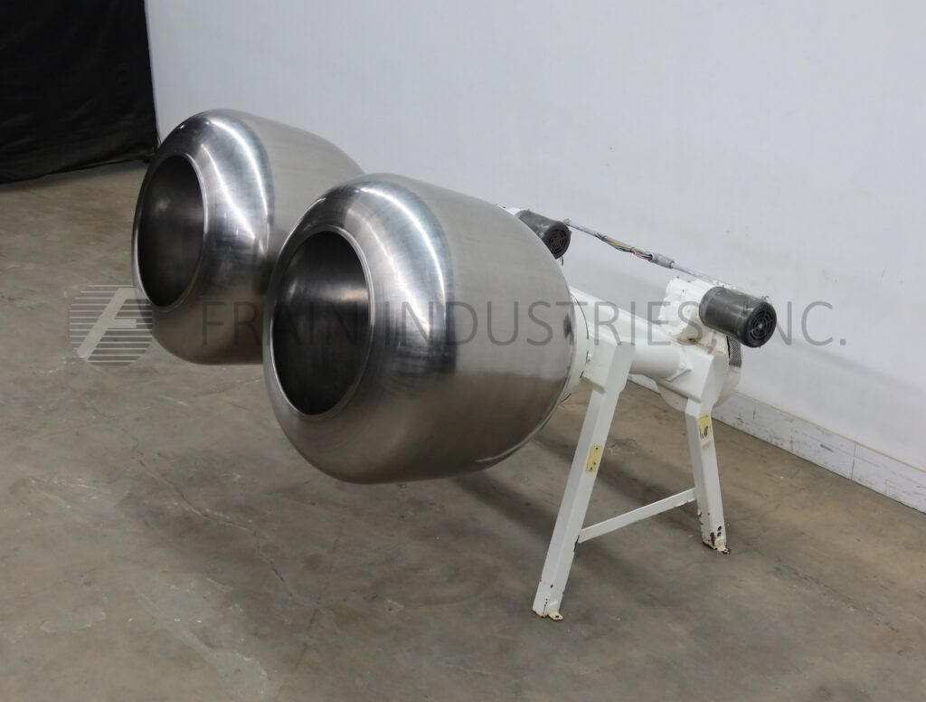 Latini, model MPS 2/42, 304 stainless steel, coating pan station with working volumes per hour – depending on materials and application. Equipped with (2) 42" diameter x 38" deep apple shaped coating bowls, each bowl has a 24" diameter access port with an infeed height of 39", powered by (2) 1½ hp drives. Mounted on painted frame.