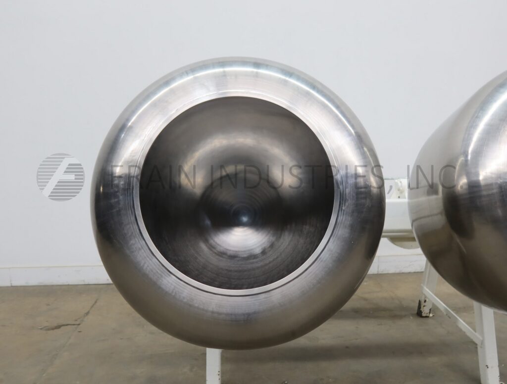 Pellegrini 300 liter, 60" Diameter, stainless steel coating pan. Equipped with two 20-1/2" diameter product ports and 8 baffles. Powered by 2 hp motor. Mounted on painted steel frame.