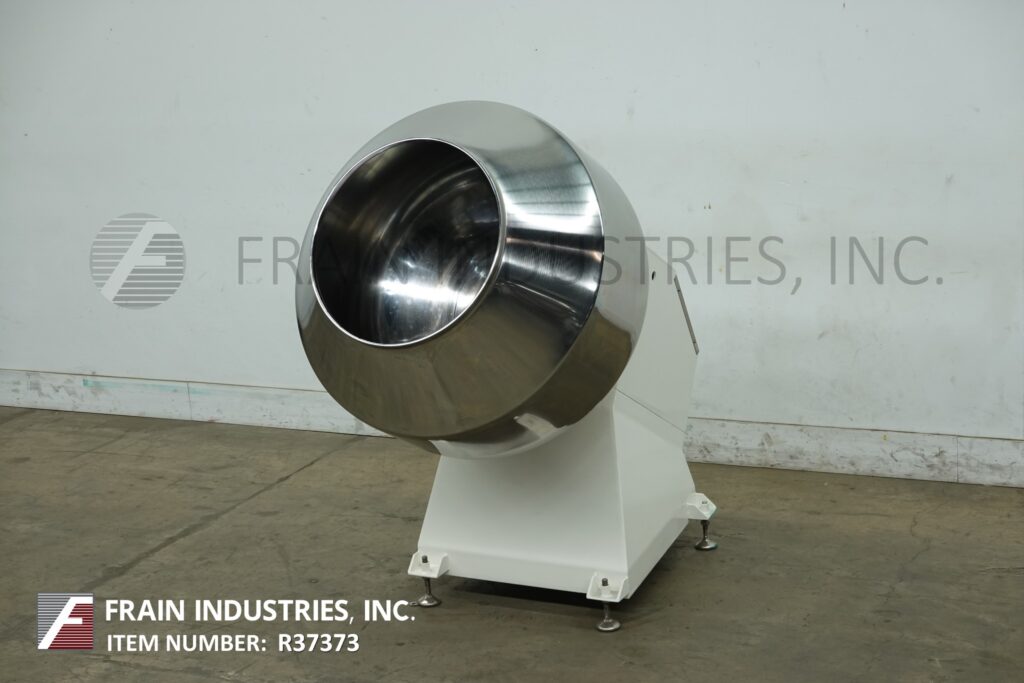 Stainless steel, conical coating pan. Pan Dimensions: 42" in Diameter; 31" in Depth. Equipped with 26" Diameter opening, four 2" high baffles, threaded 1-1/8" inlet/outlet and foot pedal.