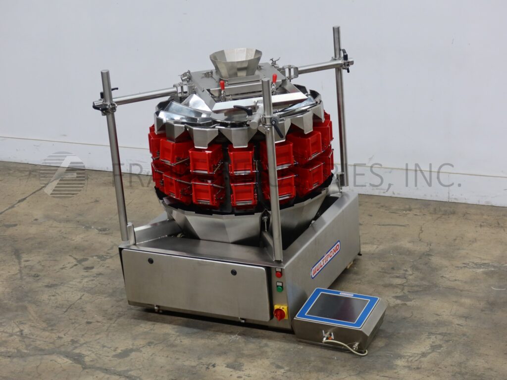 Multipond Model MP1401FFC, combination weigh scale system with pounds of product per hour – depending on materials and application. Equipped with stainless steel center cone and ring assembly and has (14) 11" Long x 6" Wide x 1-1/2" Deep stainless steel feed trays with (14) 4-3/4" Long x 4" Wide x 6-1/2" Deep, plastic pre-feed and weigh buckets, stainless steel discharge chute and 1000 series trough / base with calibration weights of 200 grams and weigh range of 1000 grams. Has 1 litre total and .7 litre usable bucket capacity and can do IQF products and the plastic buckets are wash down.