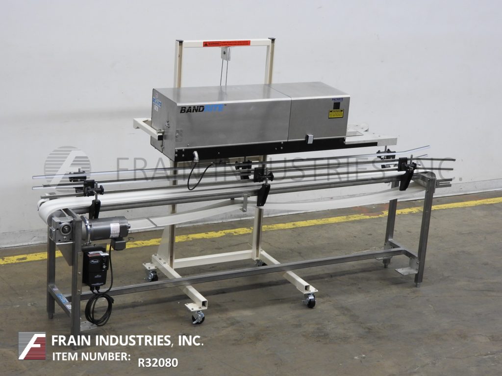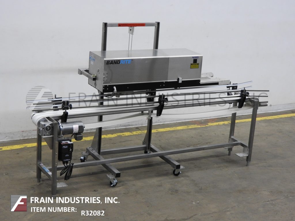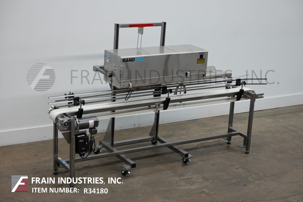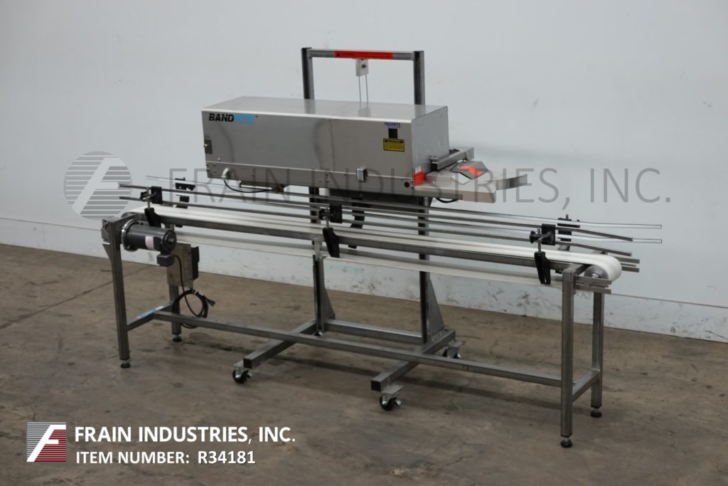Bandrite, Model 6000, Right to left, automatic, continuous motion, stainless steel, band style, bag sealer. Rated from 0 to 750 inches per minute with number of product – depending on materials, application and operator dexterity. Equipped with bag trim station, 1 line coder, ¾" wide heat sealing bar and cooling bar, angled sealing and tilt away drive head, non-marking carrier belts with adjustable running speeds and temperature controls up to 600 Deg F. Hand crank height adjustable for different size bags. Mounted over 6" wide x 100" long belt conveyor with adjustable guide rails and powered by ¼ Hp drive.