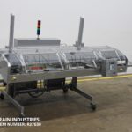 Fischbein Model PBC 6000, right to left, pre-applied glue, bag heat sealer rated from 0 to 85 linear feet per minute with number of bags – depending on materials, application and operator dexterity. Bag size range: 4" to 26" in Width up to 56" Length. Filled bag weight from 1 lbs to 110 lbs, will run most gusseted and flat bags. Equipped with front break away channel, bag guide with folding plow for single fold, electric heater to heat up and activate pre-applied glue, adjustable pressure 12" long dual compression belt section. Control panel has touch pad with heater on / off and motor run, auto, stop switches, bag jam detection, over temperature sensor shut down, with start, stop, e-stop push button controls. Mounted on hand crank height adjustable base frame with casters and 10′ long x 12" wide black PVC product belt conveyor.