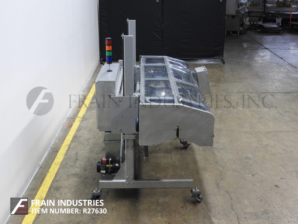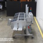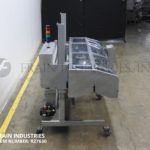 Doboy, Model S-CH-S, in line, heavy duty, band bag sealer. Rated from 0 to 100 feet per minute with number of bags – depending materials, application and operator dexterity. Can handle up to 8 mil gusseted and coated woven poly propylene bags. Equipped with (4) sets of ¼" heat sealing bars and (2) sets of water chilled cooling bars, 64" long x 1" wide teflon bands and belt thru carrier for heavier bag support with flip up safety covers. Control panel has Koyo PLC controller with touch pad operator interface and readout with e-stop and statis light bar. Mounted on hand crank, height adjustable stand to go over existing conveyor.
