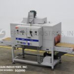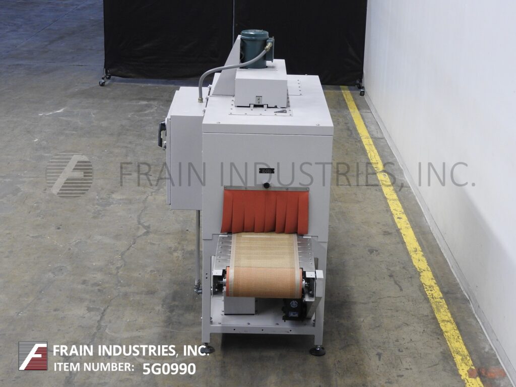 Shrink tunnel: Aperture: 21" in Width; 12" in Height; tunnel 72" in Length. Equipped with 87" long x 18" wide conveyor, top mounted blower with variable speed and temperature controls. Mounted on height adjustable (4) leg base frame.