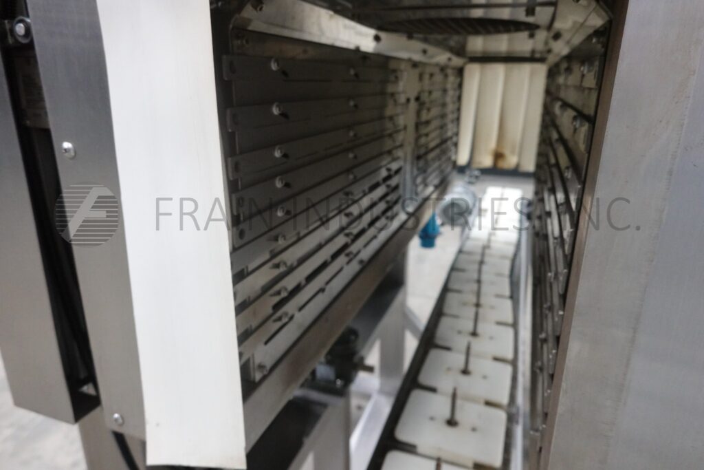 American Film & Machinery Model WSN-300 stainless steel, steam shrink tunnel and conveyor, steam generator with number of containers per minute. Can handle middle or full body and cap shrink applications with materials of PVC, PETG, OPS and PLA and a wide range of round, square, oval and other irregularly shaped containers. Equipped with 1 zone and 2 tier shrink steam tunnel with 5-1/4" wide x 8" high total aperature x 79" long chamber has multiple steam zones and adjustable manifold with direct steam heat, 4-1/2" wide x 128" long stainless steel table top product conveyor with 36" in feed and discharge height and hand crank adjustable to + / – 2". A/C vari-speed controller, with internally plumbed and steam pressure controls drip pan for condensation recovery and maximum operating temperature of 212° F, with temperature gauge and adjustable manifold for direct steam heat with steam pressure of 3-4 Kg/cm2 and 43 to 57 psi with (2) top 3-3/4" OD steam exhaust, hot and cold water in / output ports with consumption rates of 200 litres or 52 gallons an hour with steam pressure and motor speed controls. Mounted on stainless steel frame with casters and leveling legs.