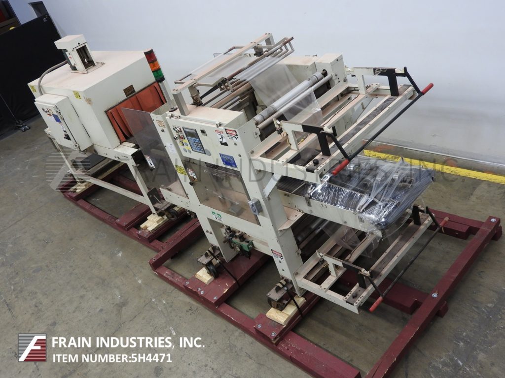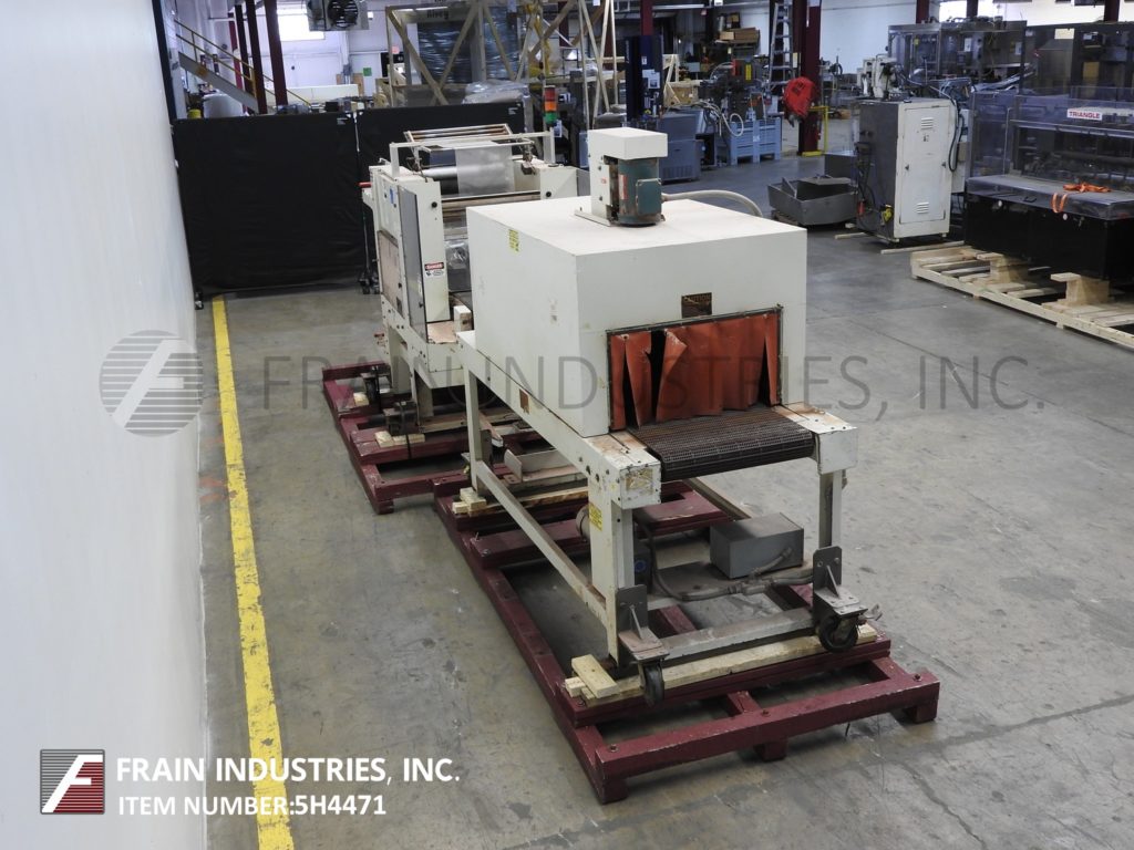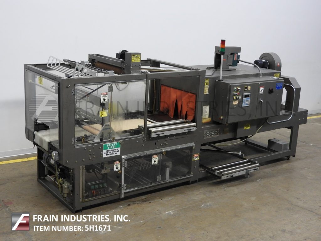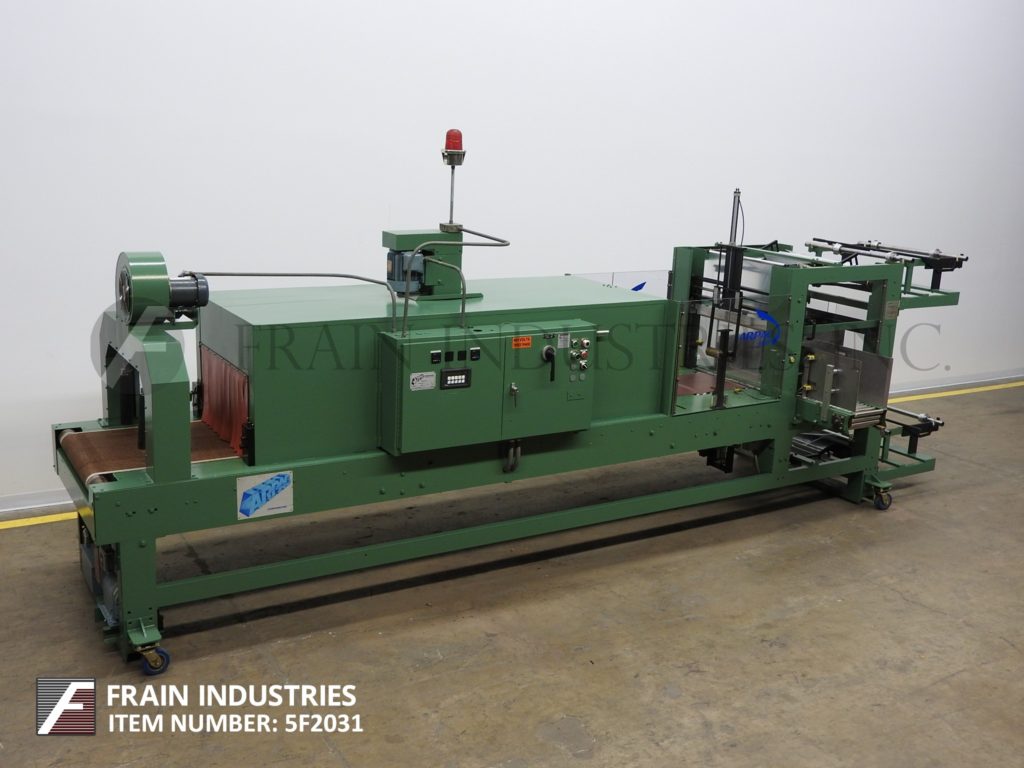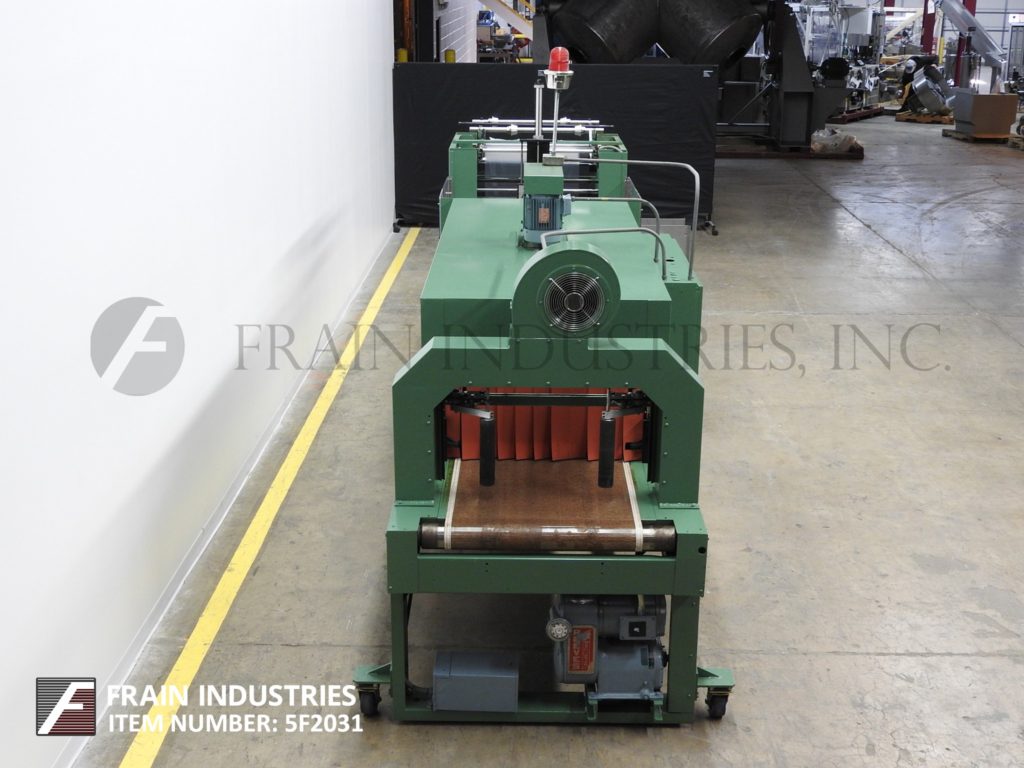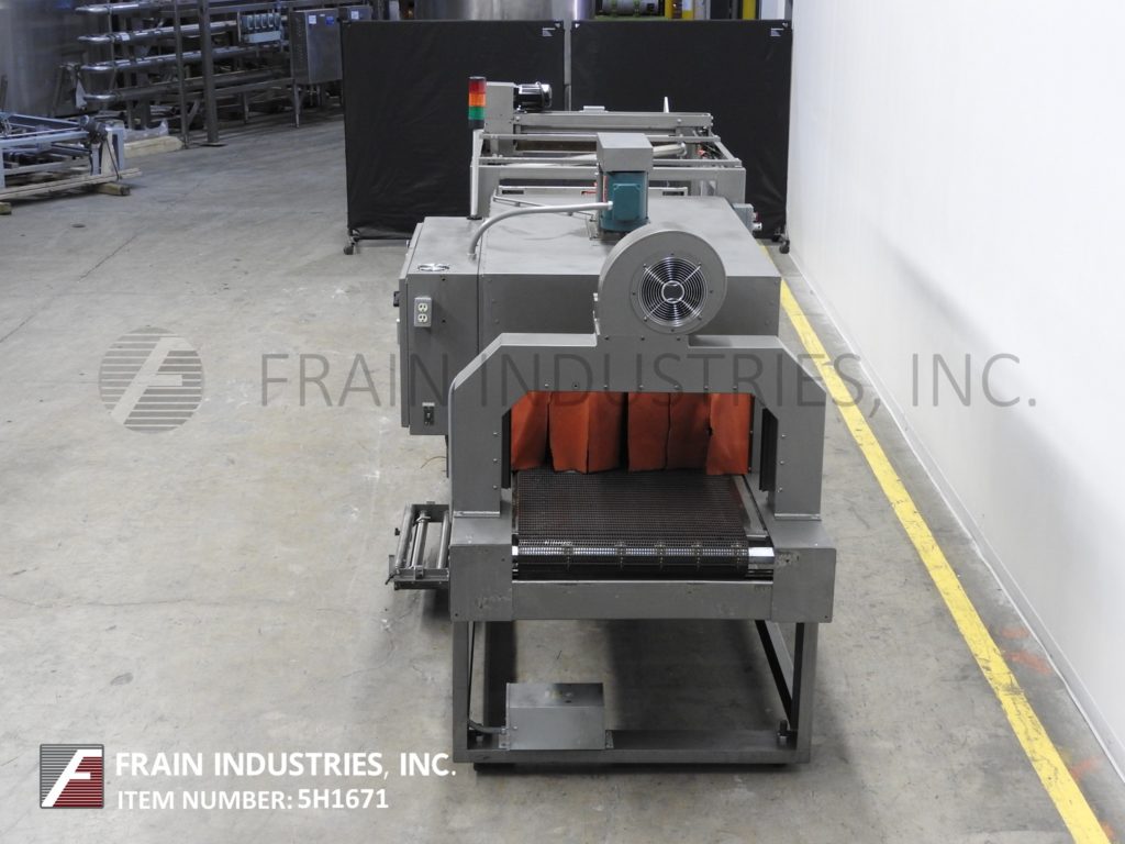 Arpac, Model 55TW-28, Inline, continuous. shrink bundler rated from 10 to 55 bundles per minute – depending on materials, application and machine configuration. Product size range: 6" to 16" in Length; 6" to 18" in Width; 2" to 10" in Height. Side mounted single-wound film roll: 27" in width; and 14" in diameter; with 3" core. Equipped with 26" long x 20" wide in-feed conveyor, 30" wide seal jaws with 10" vertical travel and 40" long x 19" wide transfer conveyor to single zone shrink tunnel with 30” wide x 18" high total aperture and 70" long tunnel with 112" long x 29" wide flex link product conveyor with top mounted blower and has discharge end cooling fan. Control panel has A/B touch pad controls and readout, start / stop / e-stop / manual seal push button controls and digital temperature controller for seal bar and tunnel cooling fan on / off switch and statis light bar.