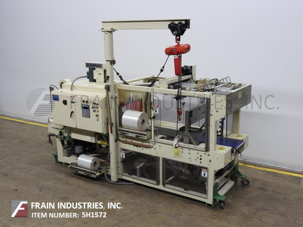 Arpac, Model 55GI-20CX, Inline, continuous motion, shrink bundler. Rated from 10 to 55 bundles per minute – depending on materials, application and machine configuration. Equipped with 13" wide x 36" long in feed conveyor, (2) 21" wide film roll holders with film splicing stations, film hoist, 21" wide walking beam seal jaws with 11" vertical travel and 13" wide x 26" long transfer conveyor to shrink tunnel. 70" long single zone shrink tunnel has 21” wide x 16" high total aperture, 90" long x 20½" wide product conveyor, cooling fan and roller side compression on discharge. Control panel with AB controller, touch pad controls with readout, start / stop / e-stop / manual seal push button controls and digital temperature controls for seal bar and tunnel. Mounted on heavy duty base frame.