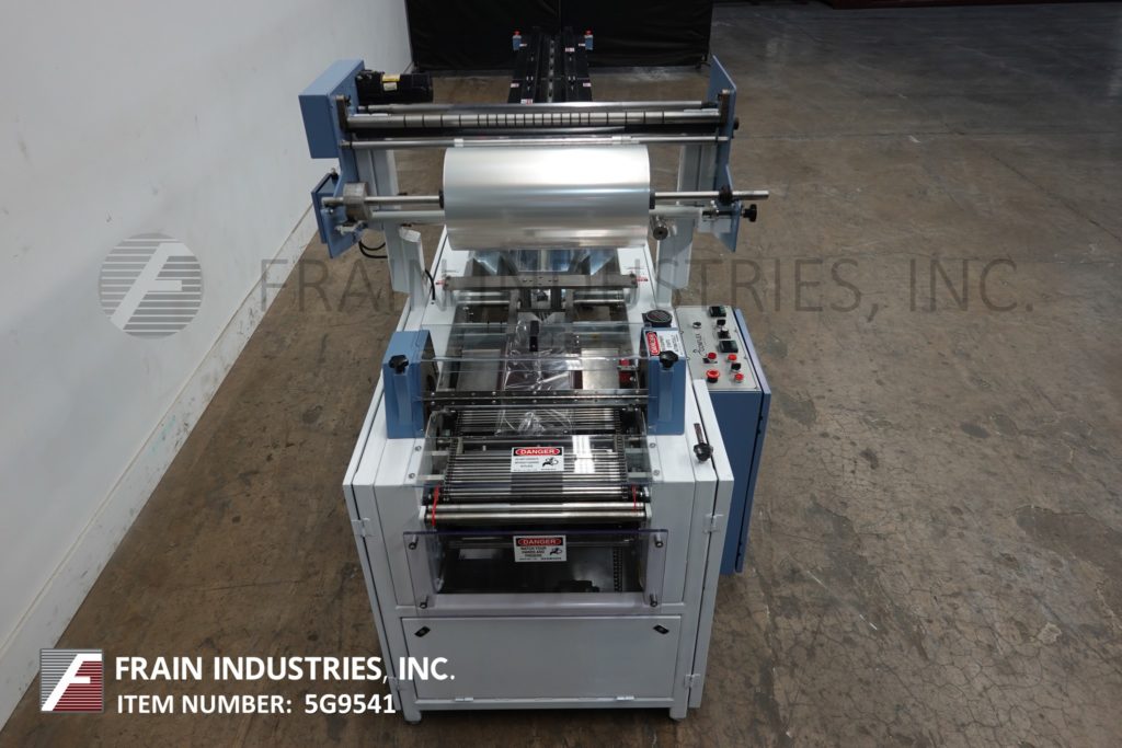 Arpac Model 108-54, automatic, right angle in feed side seal, shrink bundler rated from 10 to 20 bundles per minute – depending on materials, application and machine configuration. Equipped with (2) 4" wide x 108" long right angle product in feed conveyor, dual top and bottom 54" in width; 14" in diameter on 3" diameter cores, film carriages single product pusher arm, 54" wide heat seal jaw x 22" vertical height with dual side fold and dual 22" long side flip up tack sealers with 24" long dual eagle product conveyors to shrink tunnel. A/B PLC has touch pad controller with read out and tunnel, seal bar, left and right side tack seal temperature controllers and interlock safety guarding.
