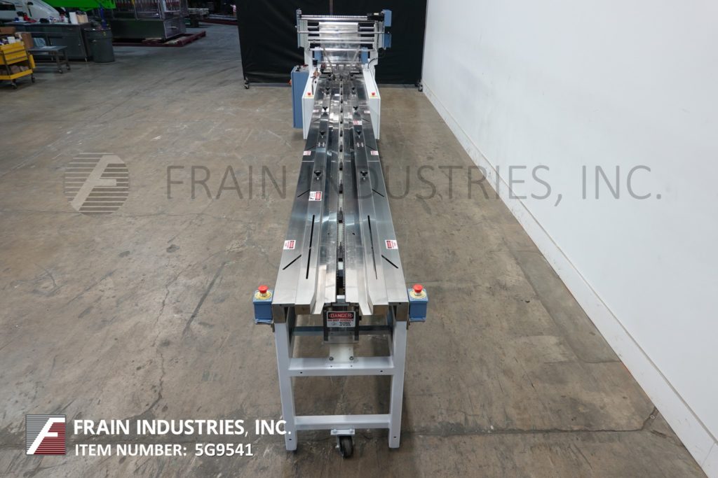 Conflex, Model CW160, continuous motion, flow thru shrink wrapper. Rated from 10 to 100 packages per minute – depending on materials, application and machine configuration. Package size range: 3" to 36" in Length; 2" to 14" in Width; (1/8)" to 5" In Height. Equipped with 192" long lugged feed conveyor set on 10" centers, powered film unwind, pin wheel perforator, forming plow, static lap seal, 16" wide reciprocating hot knife seal jaws with safety guarding, 12" long vacuum transfer belts. Control panel with variable speed dial, push button jog / start / e-stop, digital temperature control for seal bar and forward / off / reverse switch. Film Specs: up to 30" in width, up to 12" in diameter on 3" core.