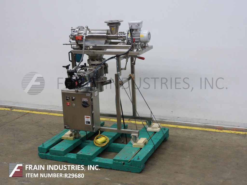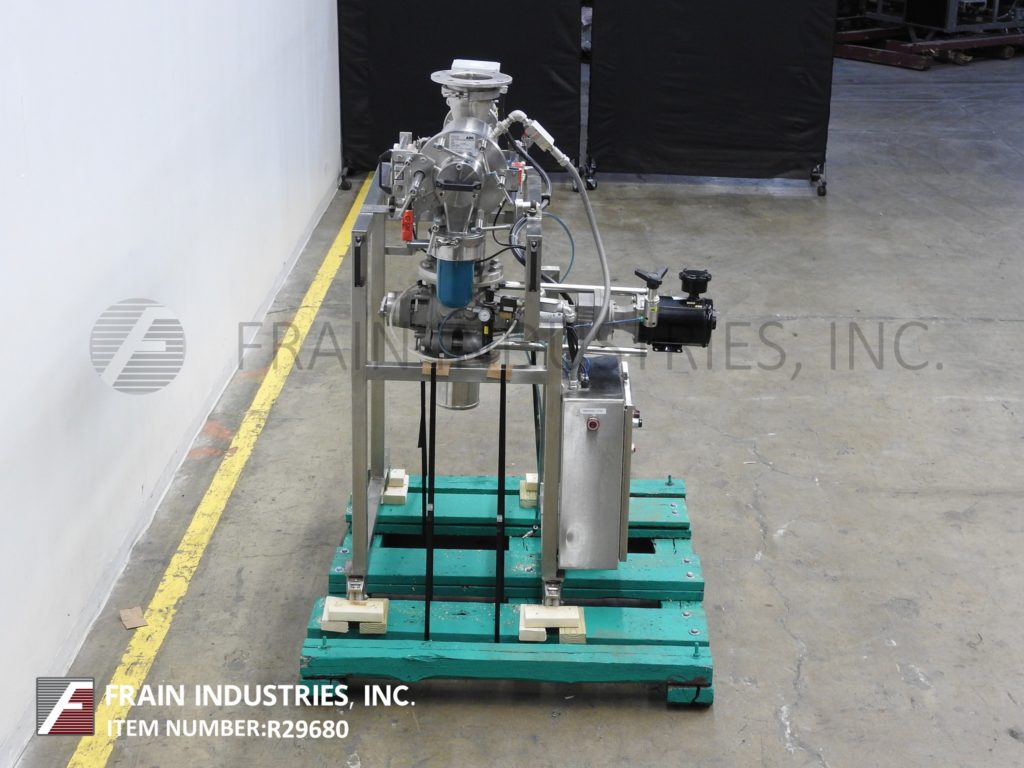 KeK Gardner Model K300C, cantilever shaft design, centrifugal sifter rated from 3 to 5 tons of product per hour – depending on materials, application and screen size. Stainless steel contact parts. Equipped with 20" long x 9" ID chamber with screen (change part per application) 9" ID front swing open access door with interlock safety switch and 26" long x 3" OD removable screw. Top 12" long x 9" wide bolt down access door with interlock safety switch and 7" OD / 3-3/4" ID top flanged product port has (4) 1/2" bolt holes on 4" centers. 3-1/2" ID bottom oversize product discharge port with 25" floor clearence and 9" OD / 3-1/2" ID flanged fine dust powder discharge with (6) 1/2" bolts sent on 4" centers and 20" floor clearence. Motor drive and e-stop. Mounted on "H" style base frame with Locking casters. Ideal for de-agglomerating, scalping, classifying and conditioning of product down to a uniform size.