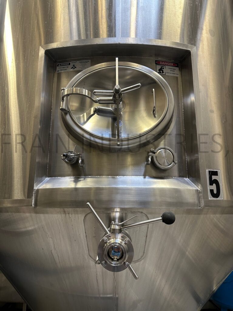 Prospero / SK SKRLJ, 4,600 gallon, 304 stainless steel, jacketed and insulated tank. Vessel Dimensions: 83" diameter x 163" straight wall with a cone bottom. Equipped with 12" x 17" side manway with bolt down cover, (2) thermowells and 2" Tri-clamp discharge with 6" ground clearance.