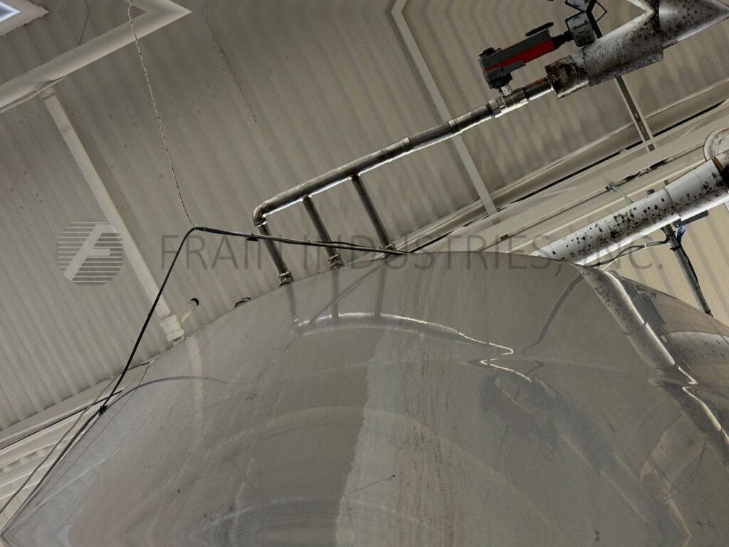 3600 gallon capacity, 304 stainless steel silo. Vessel dimensions: 72" diameter with 220" straight wall. Equipped with 18" OD bolt down man way. Dish bottom has 3½" OD / 3" ID Tri-Clamp discharge with 10" ground clearence.