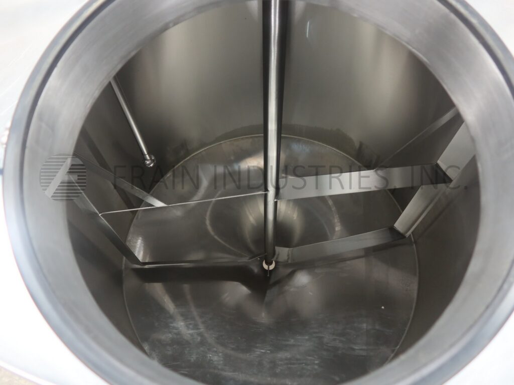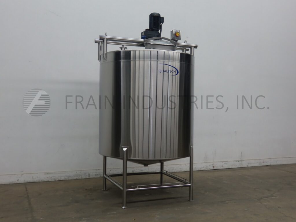 Qualtech, 1000 gallon capacity, 316 stainless steel, sweep agitated, single wall tank. Vessel dimensions: 66″ ID with a 66″ straight wall. Equipped with bridge mounted full flat and angled blade sweep agitator powered by a 3 Hp drive, 20″ diameter top mounted manway with flip up bolt down lid, (2) CIP balls mounted on 3″ Tri-clamp fed by 1″ Tri-clamp, 3″ Tri-clamp discharge with 20″ ground clearance. Mounted on (4) legs.