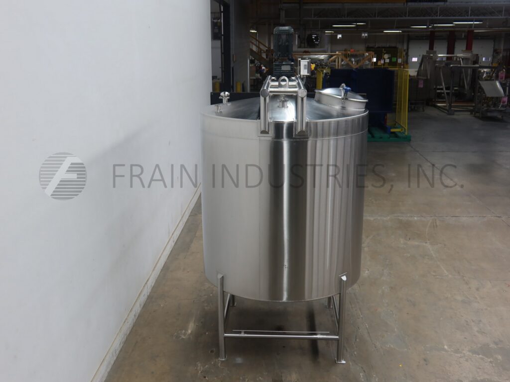 Feldmeier, 550 Gallon capacity, 316 stainless steel, internal pressure / vacuum tank. Vessel dimensions: 50" diameter x 64" straight wall. Equipped with 18" diameter bolt down cover and 2½" Tri-Clamp style discharge with 12" ground clearance. Mounted on (4) stainless steel legs.