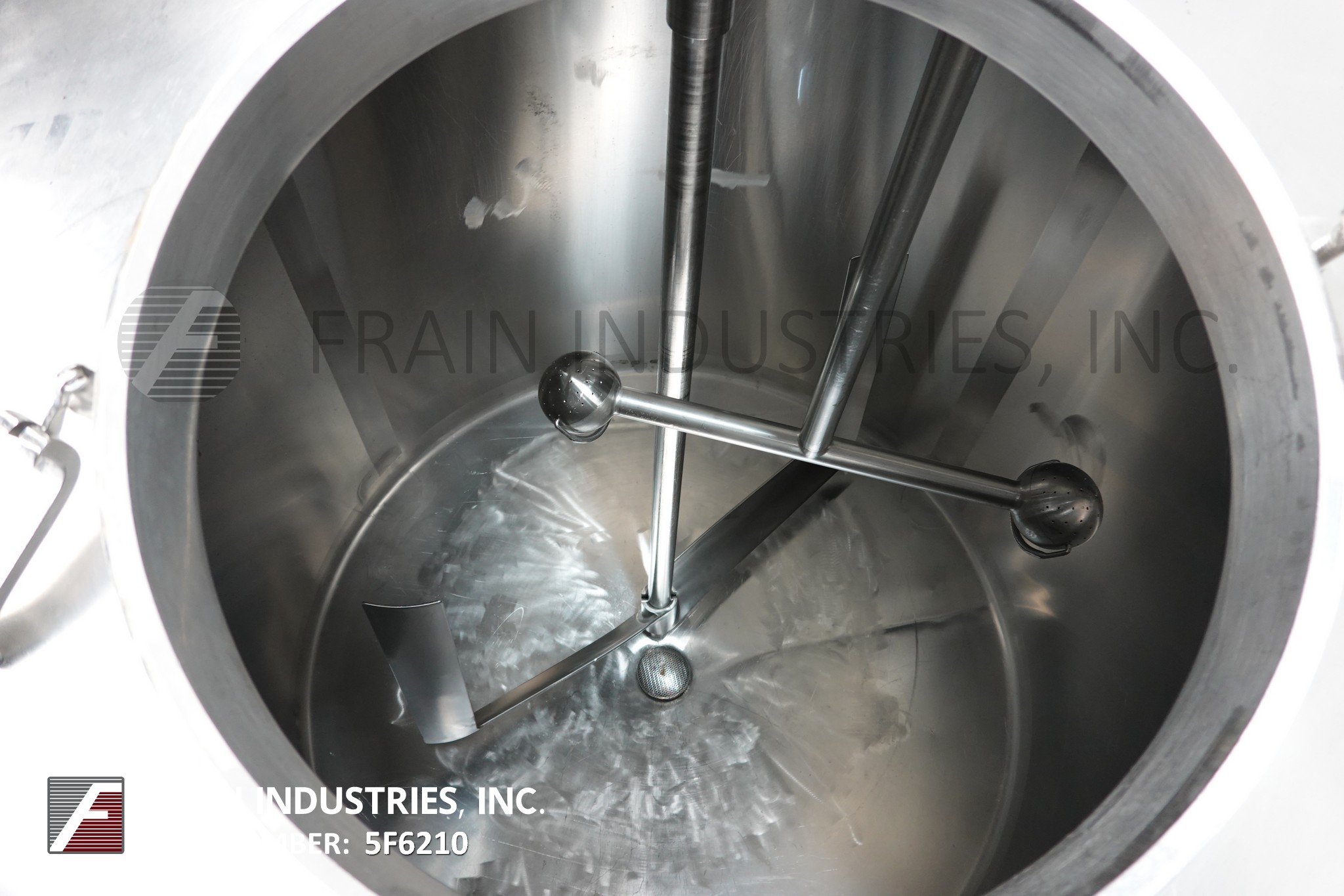 C.E. Howard, 600 gallon, 304 stainless steel, single wall tank. 79" diameter x 30" straight wall. Equipped with a 5 HP drive powering a single motion eight-paddle prop style mixer mounted on a 18" long x 18" wide platform above center of tank. Vessel has a dome top with (1) 8.5"ID, (1) 6.5"ID, (1) 5.5"ID, (1) 4.25"ID, (1) 3"ID ports and (1) 3/4” threaded inlet as well as (1) 30" x 18" oval shaped man way with lift off lid and CIP spray nozzle. The sidewall has (2) 2"ID ports. Slant bottom has (1) 8" diameter six bolt pattern flange discharge with 18" ground clearance. Mounted on (4) stainless steel legs.