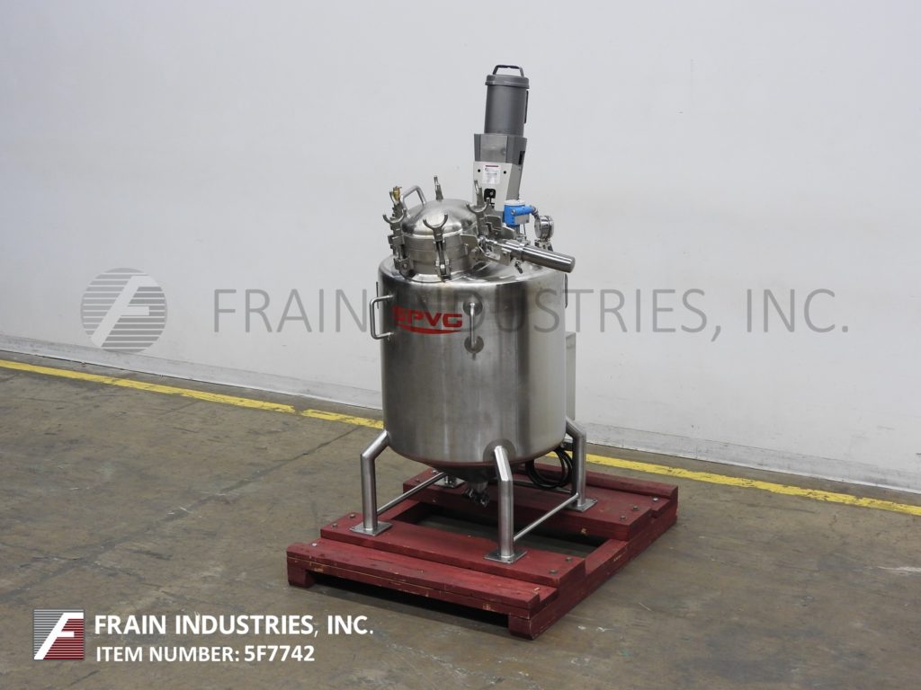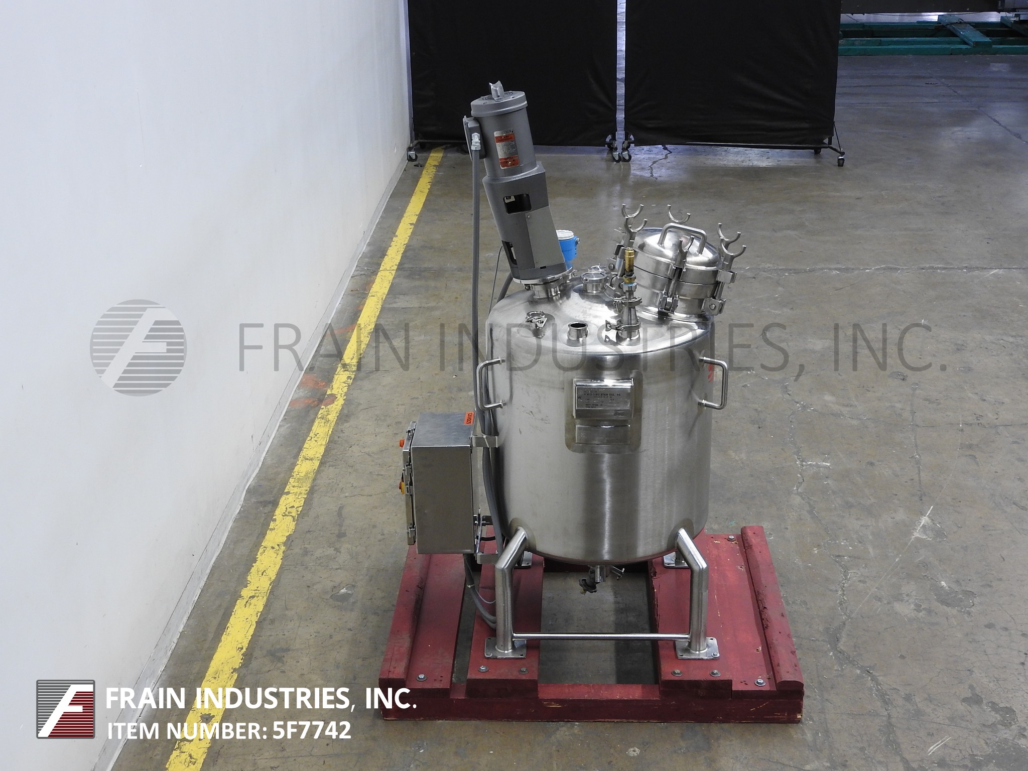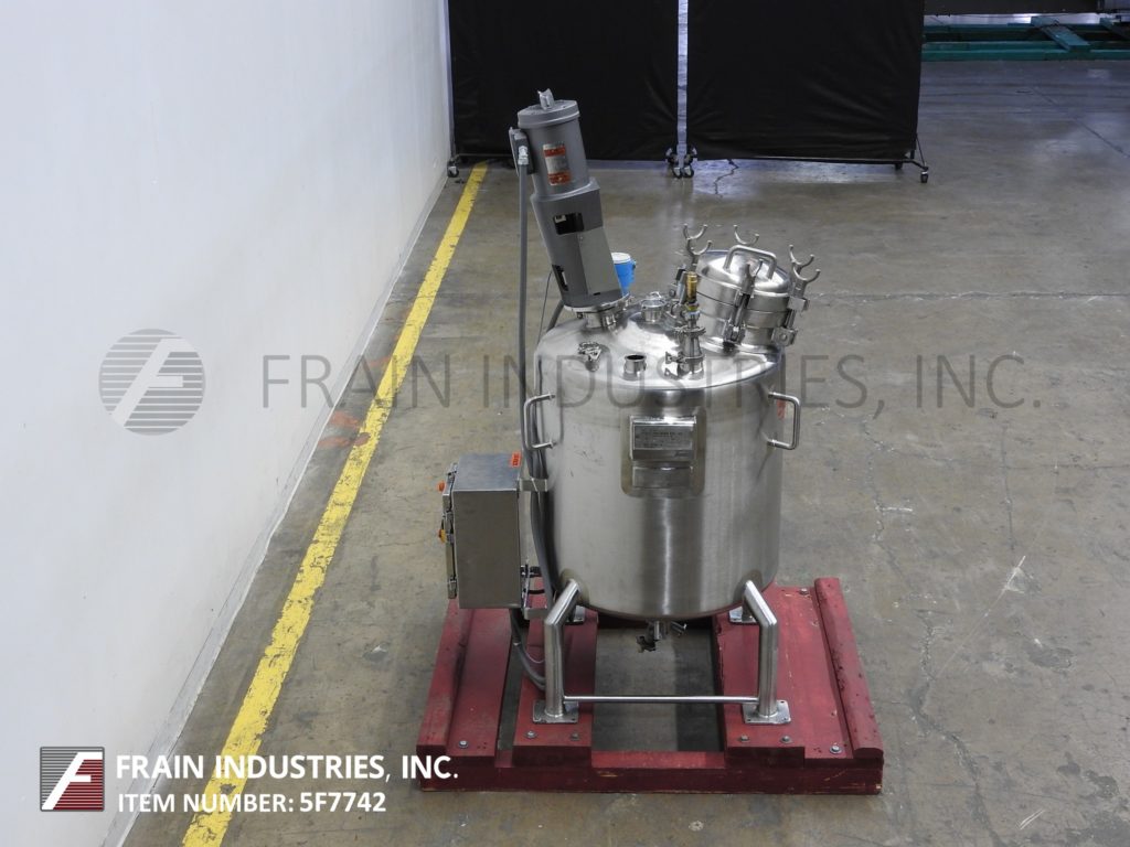 Northland Stainless Steel Inc, 2000 Liter, 528 gallon, 316 stainless steel, single wall, with full vacuum and 50 psi internal pressure mixing tank. Vessel dimensions: 48" ID x 66" straight wall. Equipped with dome top, 16" ID bolt down man way, top flange mounted prop style mixer has 9" OD flange with (8) 3/4" bolt holes on 3-1/2" centers, also (3) 2-1/2", (1) 2", (1) 3" and (2) 5" OD sanitary top ports with CIP spray balls. Full side and bottom full Internal pressure rating of: MAWP 50 psi @ 300 Deg F and MDMT of -20 Deg F @ 50 psi. Dish bottom has 2" OD staintary center bottom discharge valve with 24" floor clearance without valve 30" floor clearence and mounted on (3) stainless steel legs. UL Rated and National Board # 821