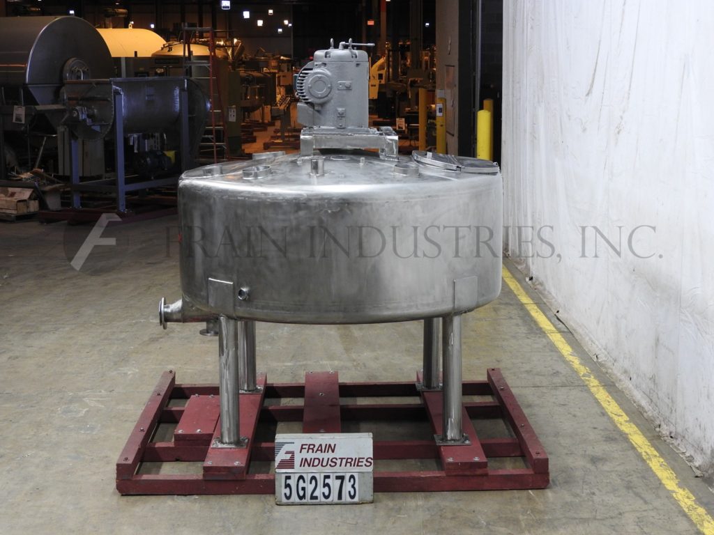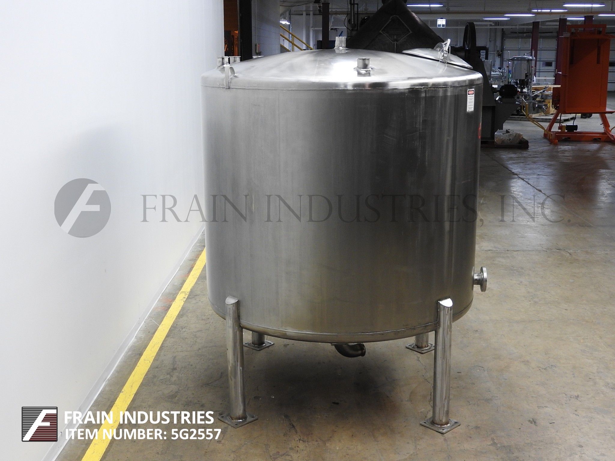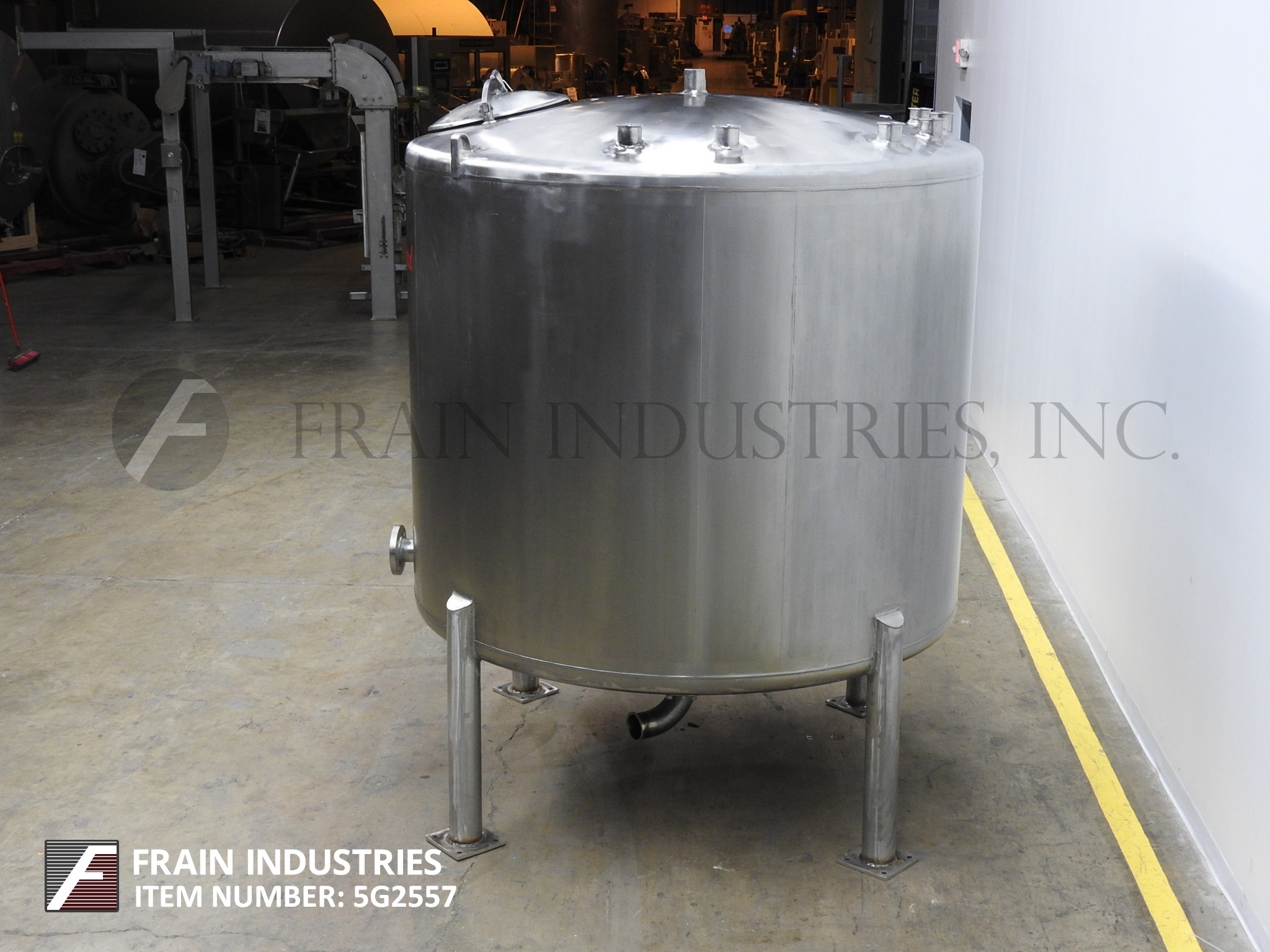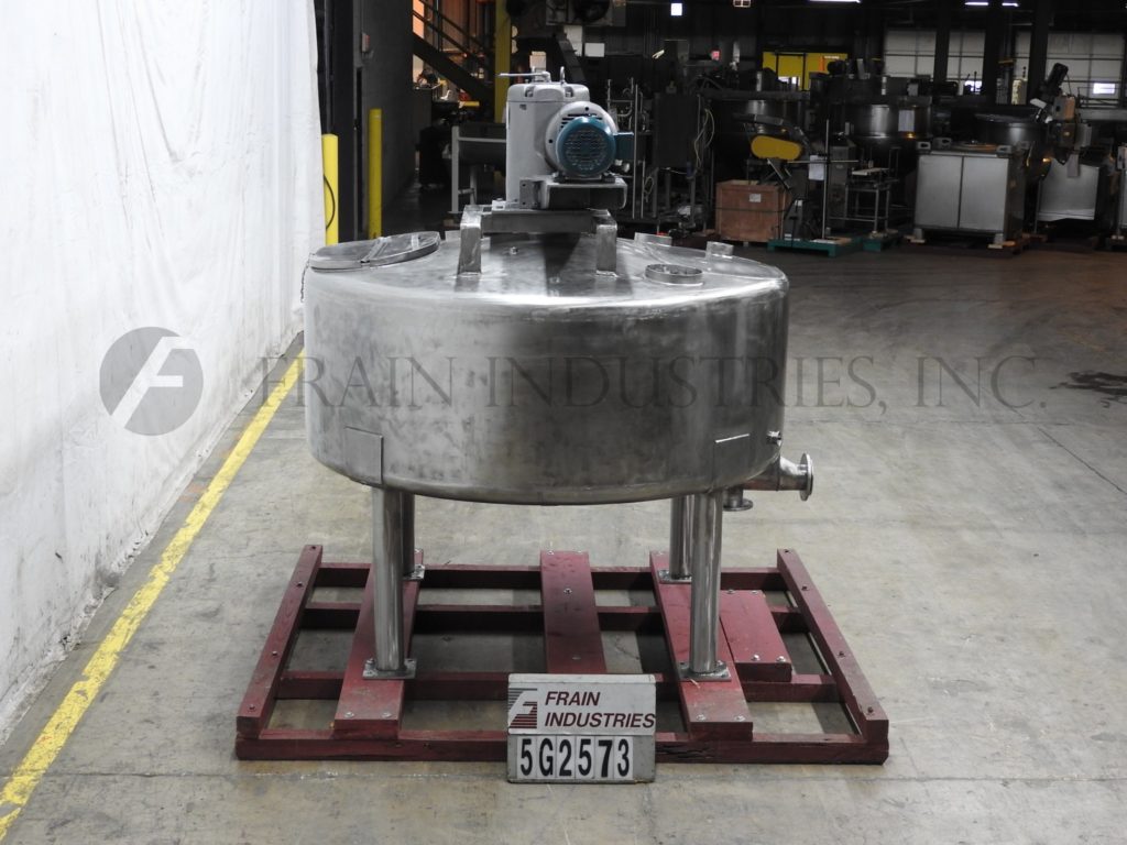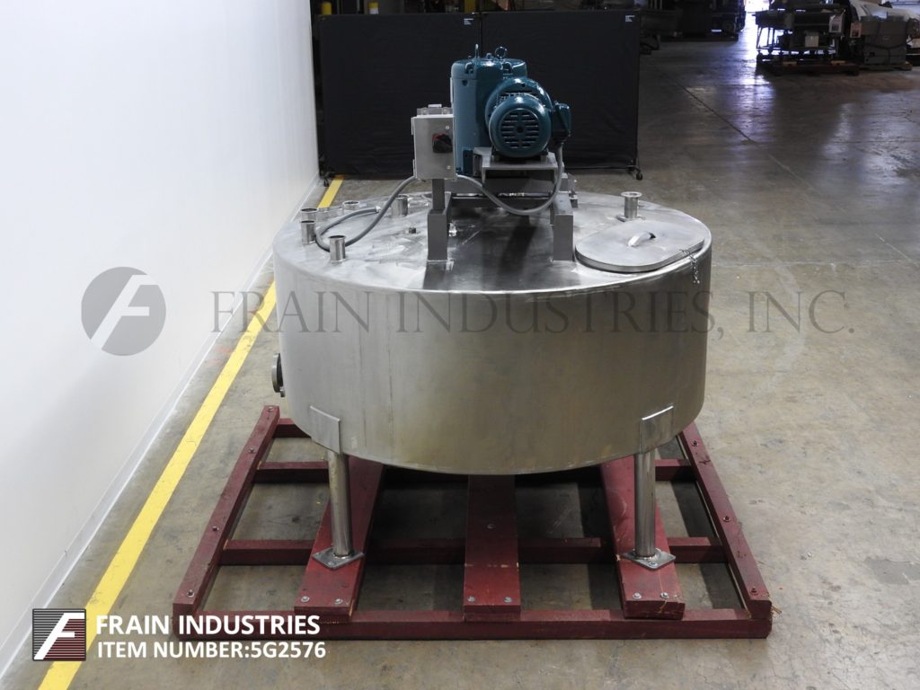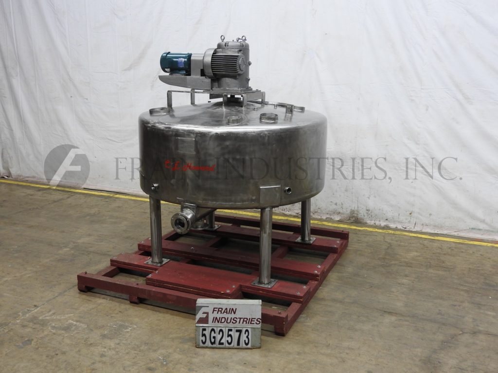 C.E. Howard, 600 gallon, 304 stainless steel, single wall tank. 79" diameter x 30" straight wall. Equipped with a 5 HP drive powering a single motion five-paddle prop style mixer. Vessel has a dome top with (1) 6"ID, (1) 5"ID, (1) 4"ID, (1) 2¾"ID, (1) 2½"ID open vents. (3) 3½"OD/2¾"ID, (2) 3"OD/2¼"ID, (1)2½"OD/1¾"ID tri-clamp fittings and (3) 3/4” threaded inlets; as well as (1) 26" x 14" oval shaped man way with lift off lid. The sidewall has (2) 2½"OD/1¾"ID tri-clamp ports. Slant bottom has (1) 8" diameter six bolt pattern flange discharge with 18" ground clearance. Mounted on (4) stainless steel legs.