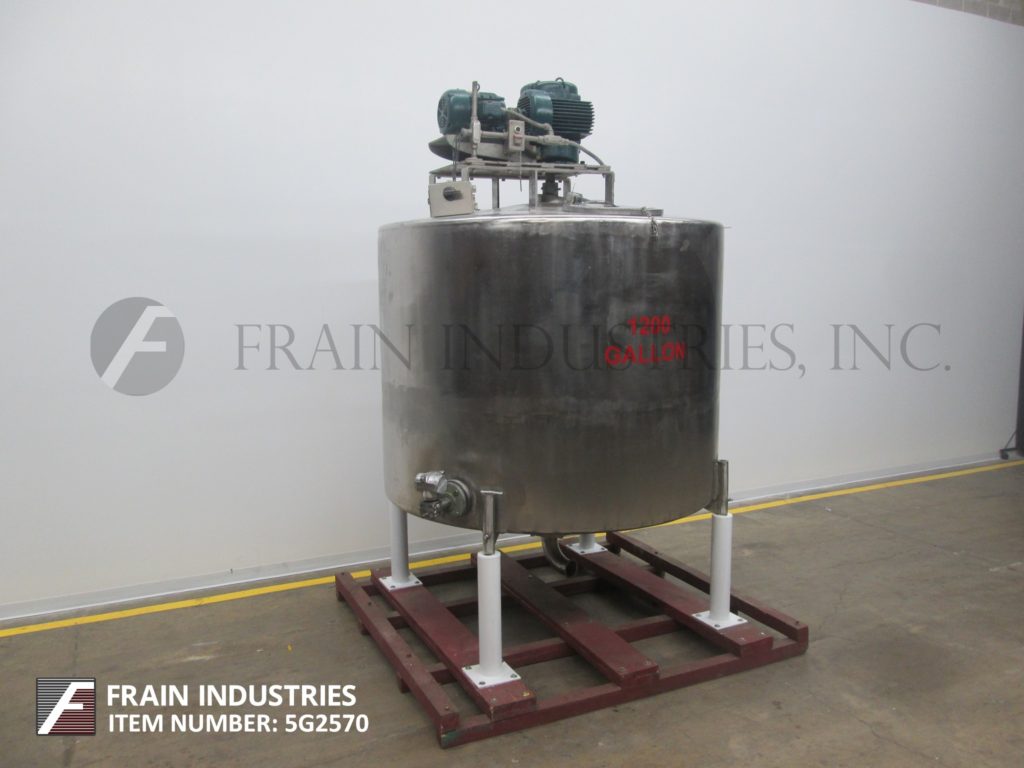 Langsenkamp, 1200 gallon, 304 stainless steel single wall tank. 78" diameter x 62" straight wall. Equipped with a single motion dual six-paddle prop style mixer mounted above center of tank. Vessel has a dome top with (1) 19" diameter man way, (2) 6"ID vents and (2) 1" threaded CIP attachments. Dish bottom has (1) 3¾"ID/4½OD tri-clamp style fitting with 8" ground clearance. Mounted on (4) stainless steel legs.