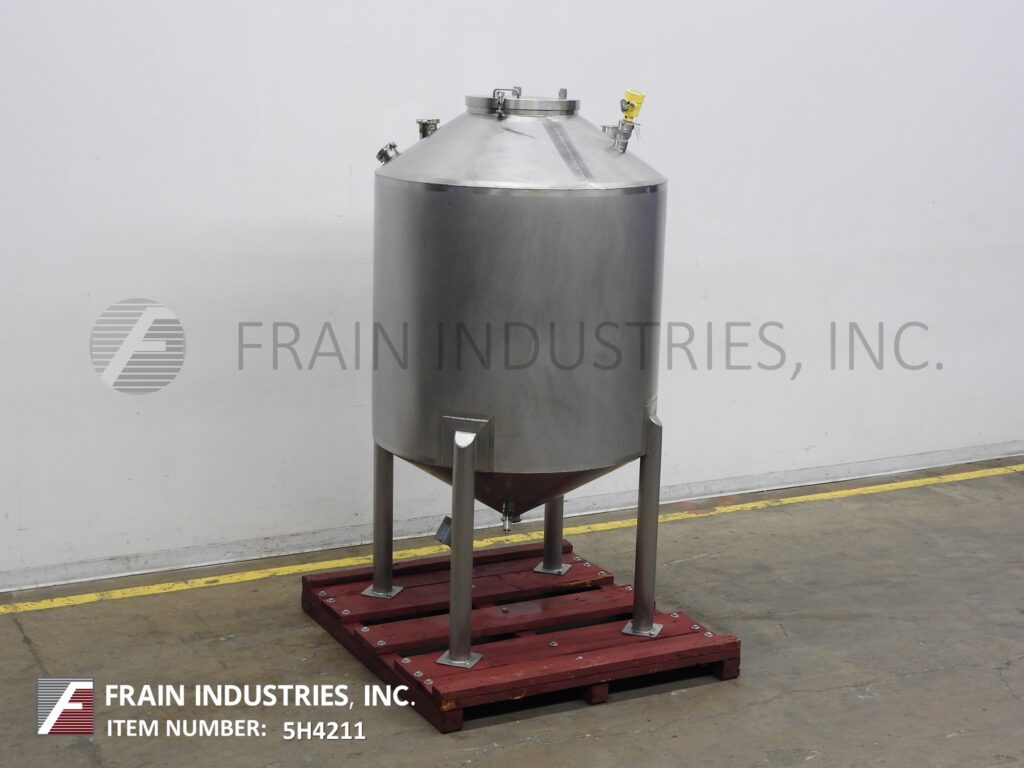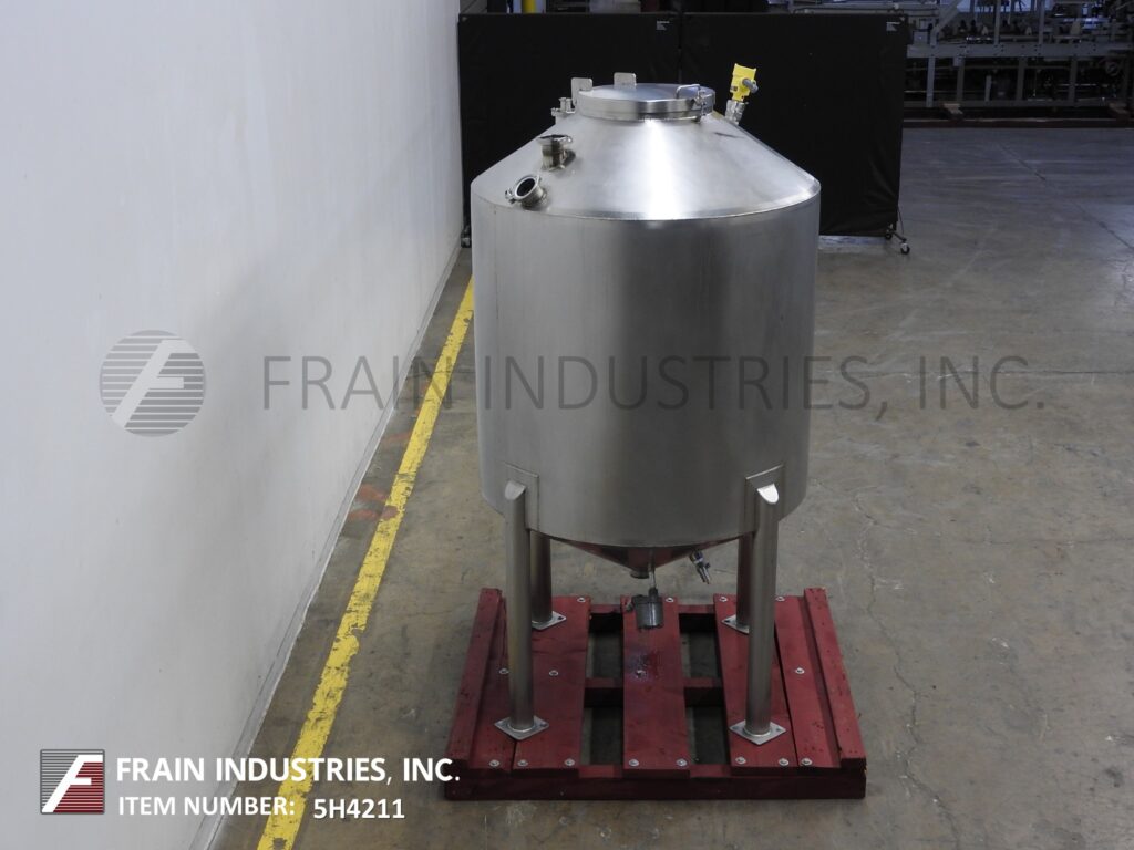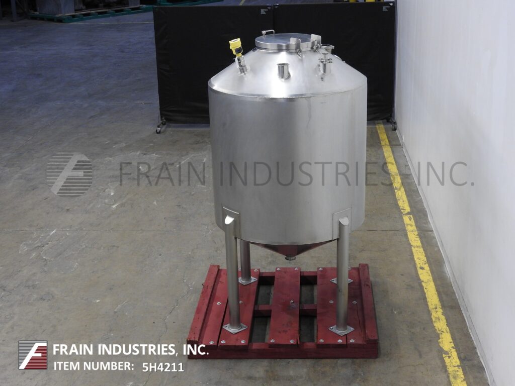 350 gallon, 304 stainless steel, cone bottom tank. Vessel Dimensions: 48" diameter x 65" deep. Equipped with an 18" manway, 44" straight wall, thermowell and 3½"OD / 3"ID Tri-clamp style bottom discharge with 16" ground clearance. Mounted on (4) legs.