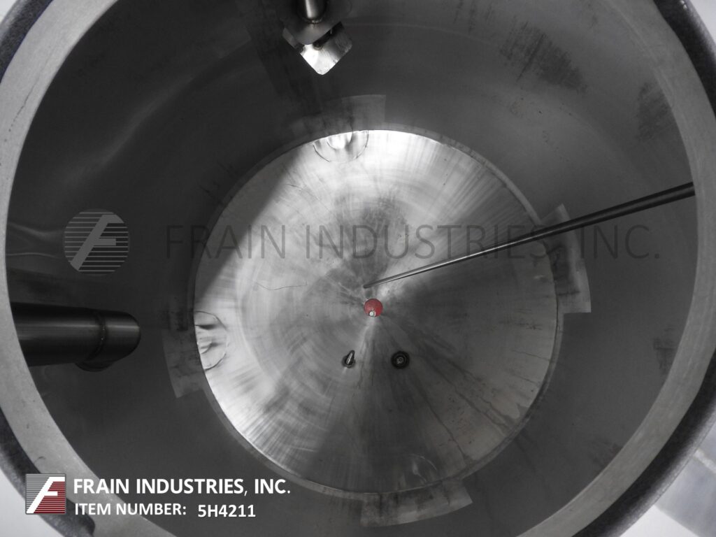 Lee, 1500 gallon capacity, 316 stainless steel insulated process tank. Vessel dimensions: 78" diameter with 86" straight wall. Equipped with dome top, 24" OD flip top man way and top mounted 15 Hp / 10 hp double motion scrape surface agitation. Dish bottom has 4½" OD / 4" ID center bottom ball valve discharge with 32" ground clearence.